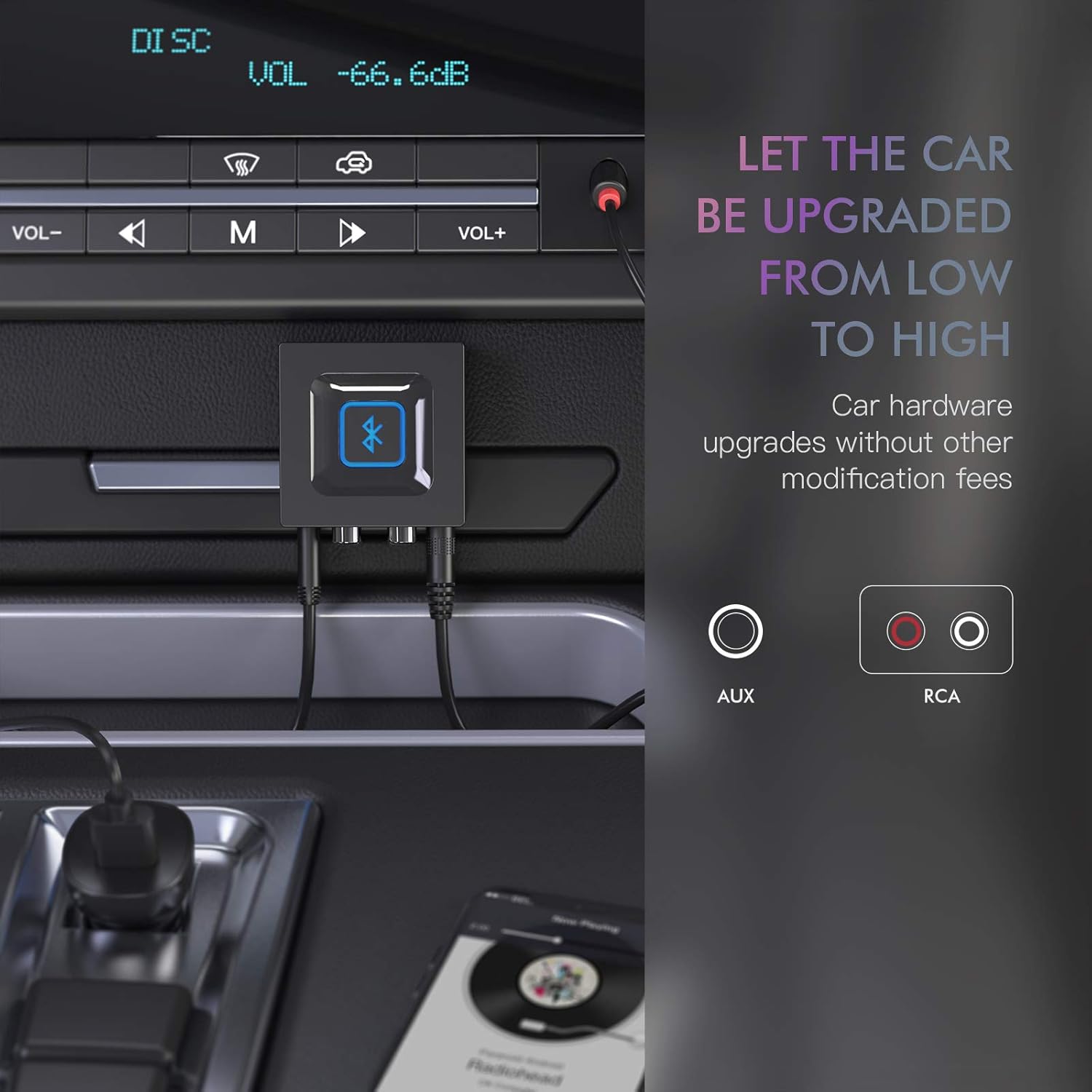 This went straight into my 2007 car which has RC connectors in the center console but no bluetooth for audio. It has BT for phone calls but cannot play music of podcasts or audiobooks.The box contains all the cables you will need be it RC or aux jack, and power USB power plugs.I like this in my car because it powers on/off when the power is applied and disconnected via ignition. My 12v port is not constantly powered. I’m not sure if this has a battery, so look at the description. I was more interested in something that shuts down and powers up.My phone connects instantly when I get in the car and as soon as I hit play, I am listening.Setting it up was simple and quick. I had it installed and running in less than 5 minutes. It has one big button you need to press and hold to make the initial connection, but after that, its all automatic. It is a bit bigger than some other items, 2″x2″x1″ (?) so if you can run your RC output into the glovebox or somewhere, that’s perfect, and it wont be bouncing and rolling around your car.FYI, this item will certainly work with an older home stereo receiver via the RC jacks. I have a similar unit and this is great for connecting your modern devices to your classic, high-end audio.
