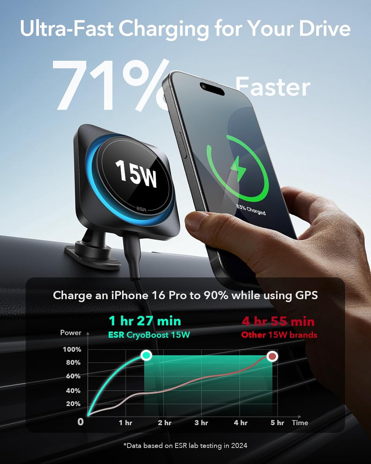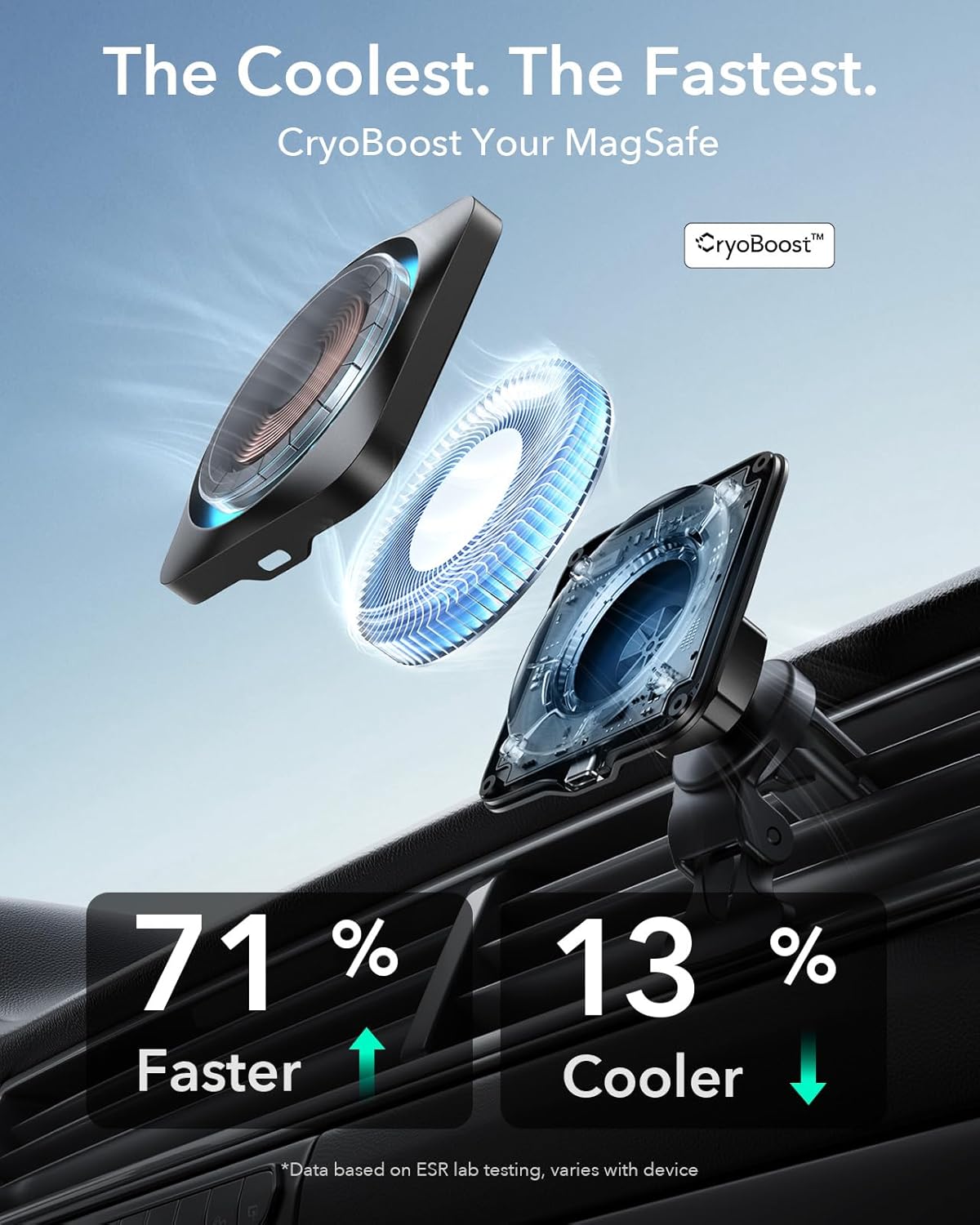 ESR for 15W MagSafe Car Mount Charger with CryoBoost, Phone Cooling MagSafe Car Charger, Air Vent/Dashboard Wireless Charging for iPhone 17e/17/16/15/14/13/12, S26/S25 Series, Pixel 10, Fast Charger