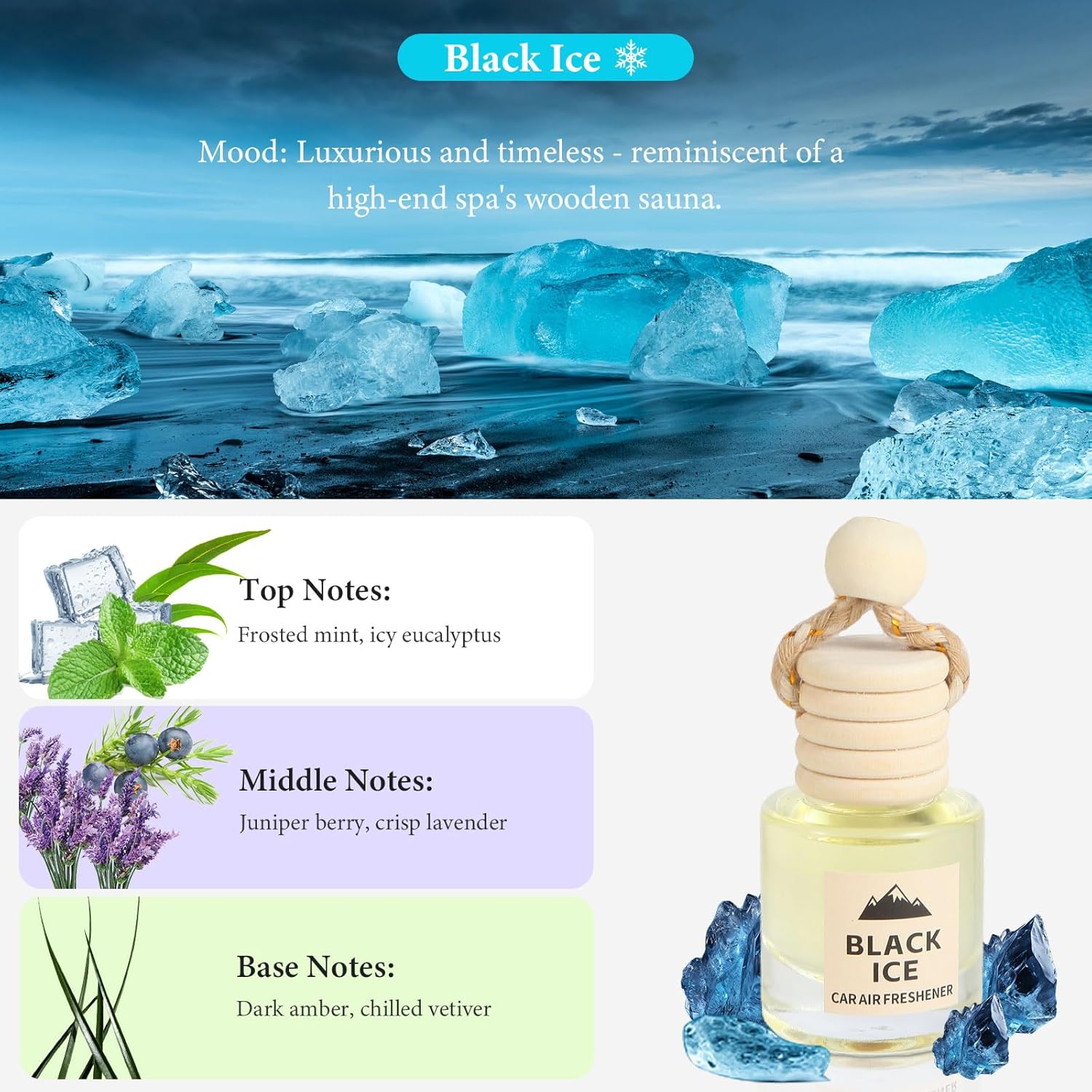 This black ice air freshener delivers a bold, clean scent in a stylish car air freshener hanging design. With its slow-release car air freshener diffuser system, it keeps your ride smelling fresh and cool for weeks without feeling overpowering.