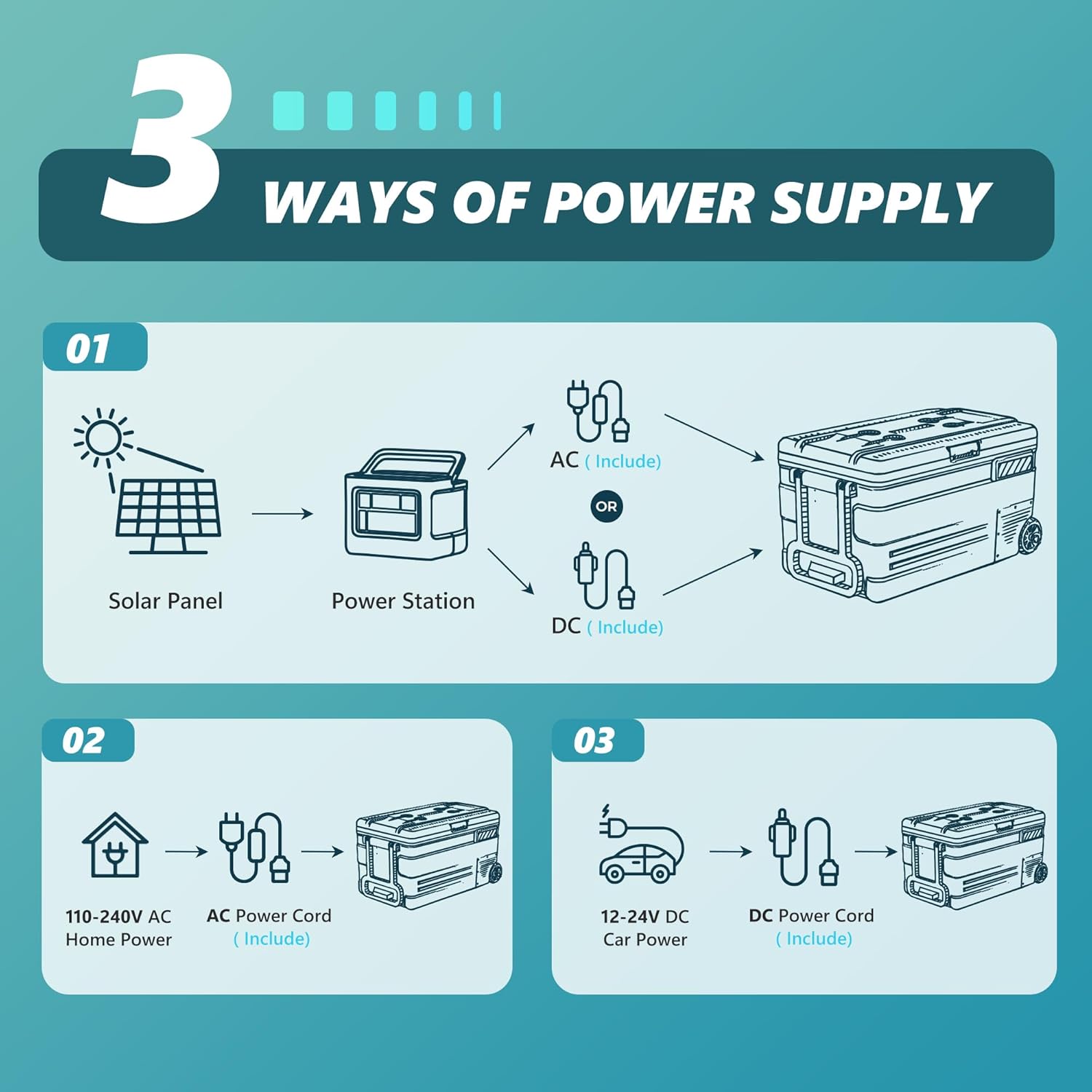 Battery Protection & Multiple Power Supplies; The portable electric cooler freezer features a three-level battery protection system, adjustable from 9.6V to 12.4V in L/M/H modes, preventing overload or vehicle battery drain. This protection makes the car fridge suitable for use in sedans, SUVs, trucks, and most other vehicles. It can be powered by either DC or AC, making it versatile for various scenarios