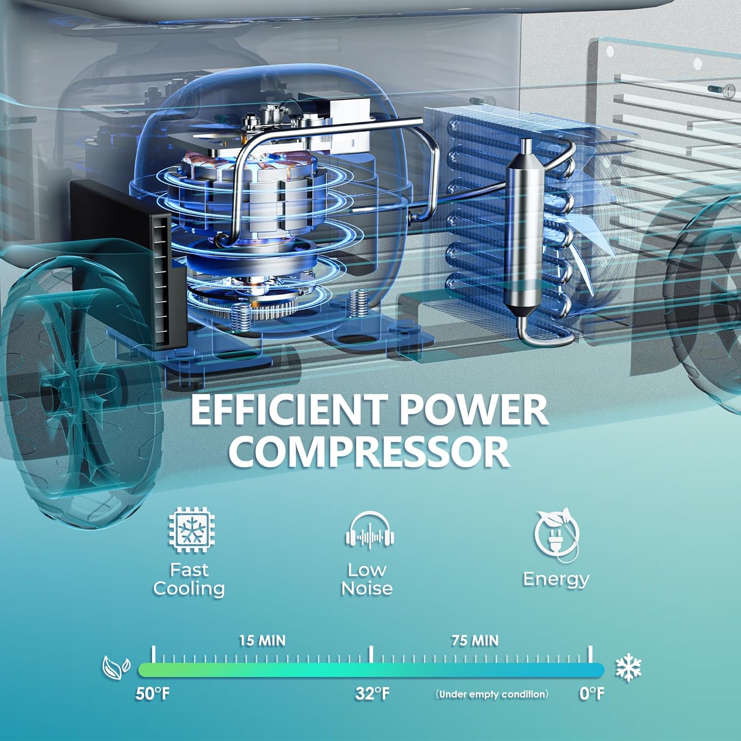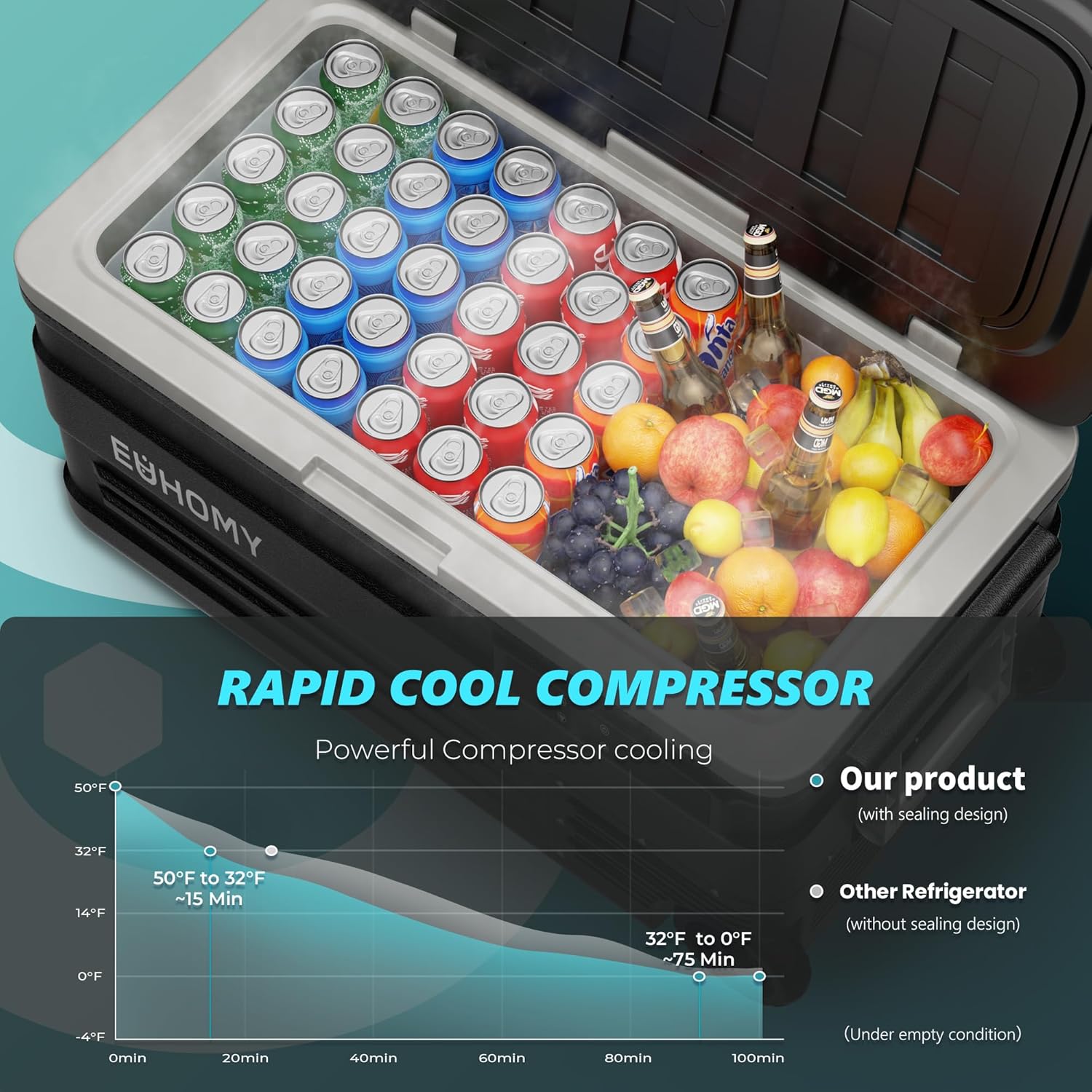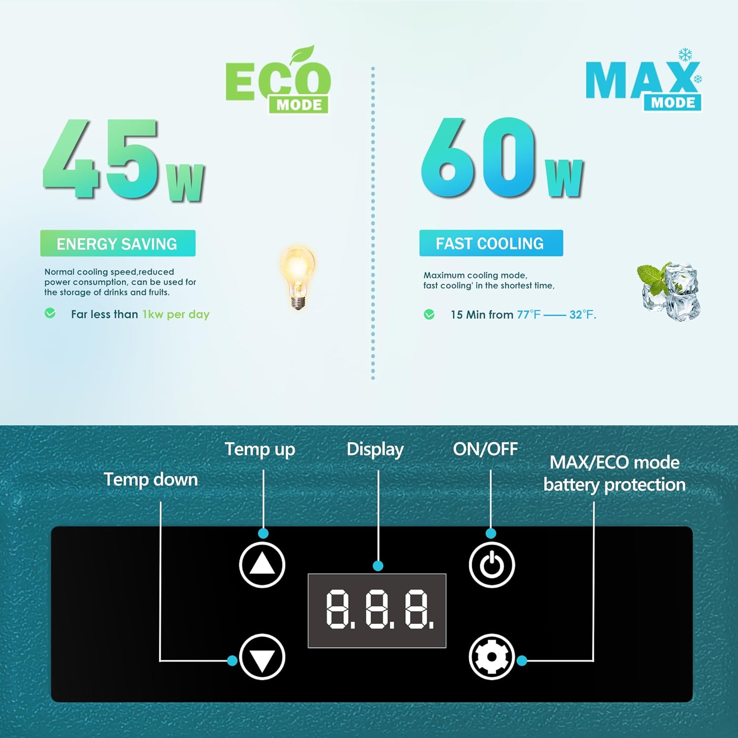 Powerful Compressor & Excellent Insulation; The portable freezer is equipped with a high-efficiency variable frequency compressor, offering powerful cooling and a temperature range from 0°F to 68°F. UL energy-certified, the 12 volt cooler features both ECO and MAX cooling modes, consuming only 45W. The 40mm thick insulated, durable exterior ensures optimal temperature maintenance