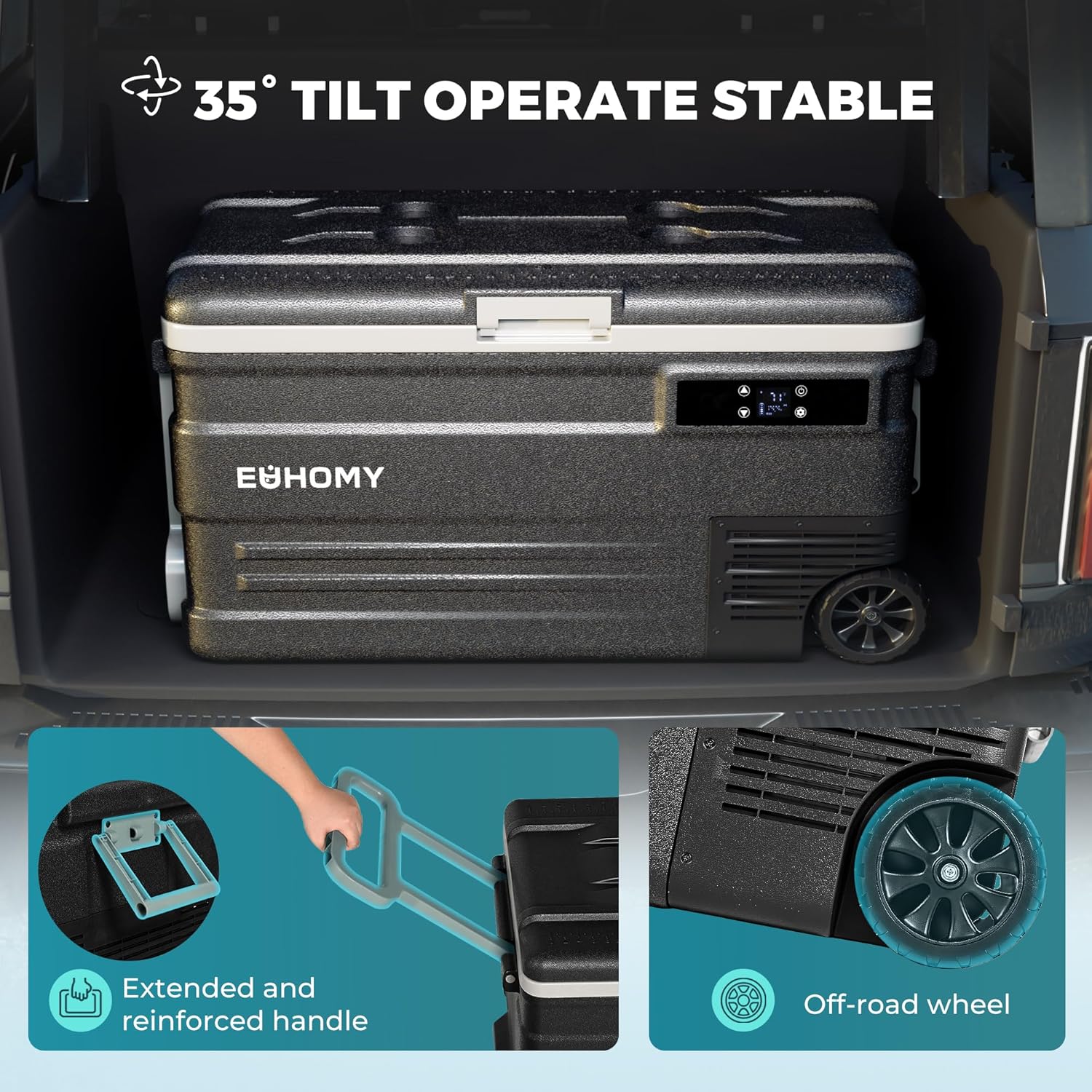 Humanized & Portable Design; With a massive 80Quart capacity and no partition design, the car refrigerator is ideal for storing larger items. The 12 volt refrigerator is equipped with sturdy handles and off-road wheels, making it easy to move. The user-friendly LCD panel of the 12v fridge helps you adjust the temperature with ease