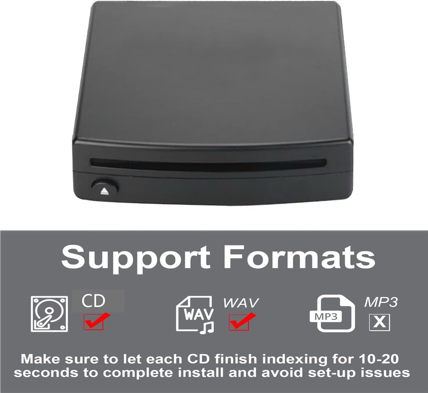 【CD PLAYER Compatible Formats】The CD Player compatible formats are WMA or WAV, the MP3 format will NOT play. Enjoy your favorite Music CD’s and audiobooks, through your vehicle’s factory radio and sound system.(Note:Make sure to let each CD finish indexing for 10-20 seconds, to complete installation and avoid set-up issues.)