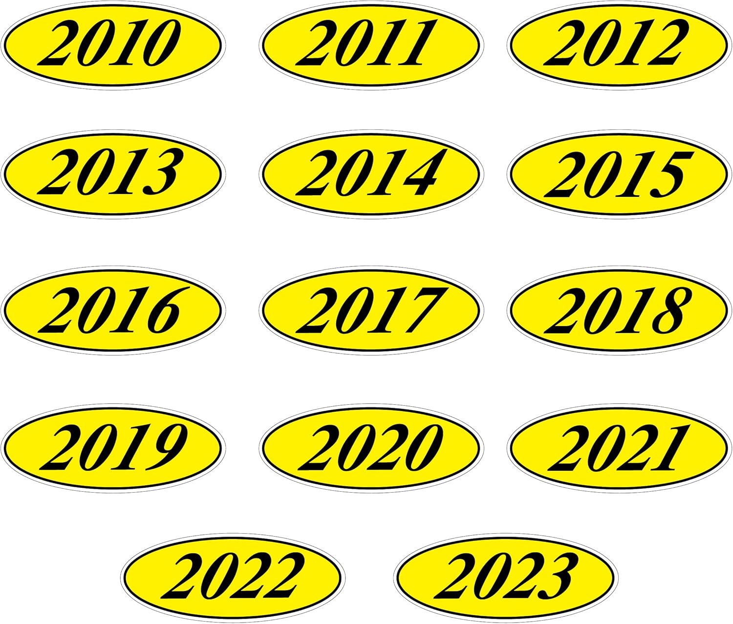 EZ-Line Oval Model Windshield Year Stickers for Car Windows Large Vinyl Dealership Supplies 14 Dozen Pro Pack 1 Dozen Each Year 2010-2023 (Black Yellow)