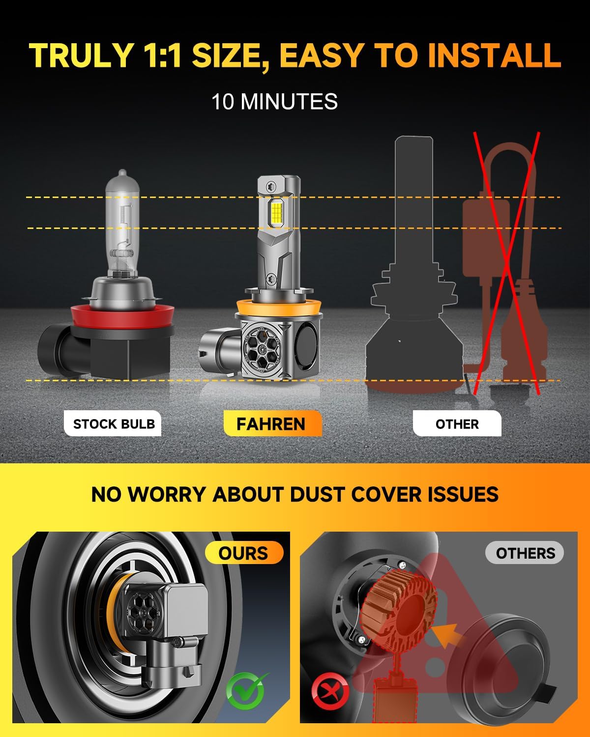 【Unrivaled Durability and Heat Management for Maximum Longevity】Our fahren H11 LED Dash & Instrument Bulbs are expertly engineered with aerospace-grade aluminum and a large copper substrate to ensure exceptional heat dissipation, preventing overheating and guaranteeing a 70,000+ hour lifespan. Featuring a 23,000 RPM high-speed cooling fan, these H11 with cutting-edge thermal management technology, they reduce the need for frequent bulb replacements and offering a hassle-free, dependable driving experience for years to come.
