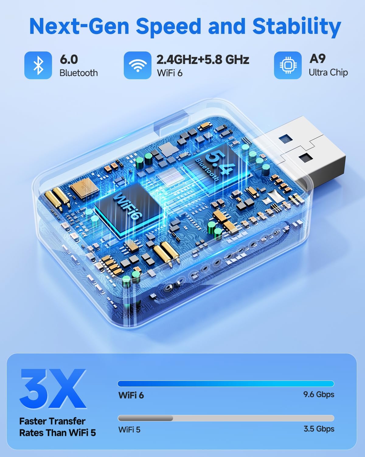 【Next-Gen A9 Chip Inside】The FAHREN carplay wireless adapter for apple pnone features an upgraded size design, identical in appearance to a USB flash drive. It incorporates the latest upgraded A9 chip, supporting 2.4GHz+5.8GHz Wi-Fi and Bluetooth 6.0 technology. It enables 3-second quick connection, and supports OTA firmware updates.