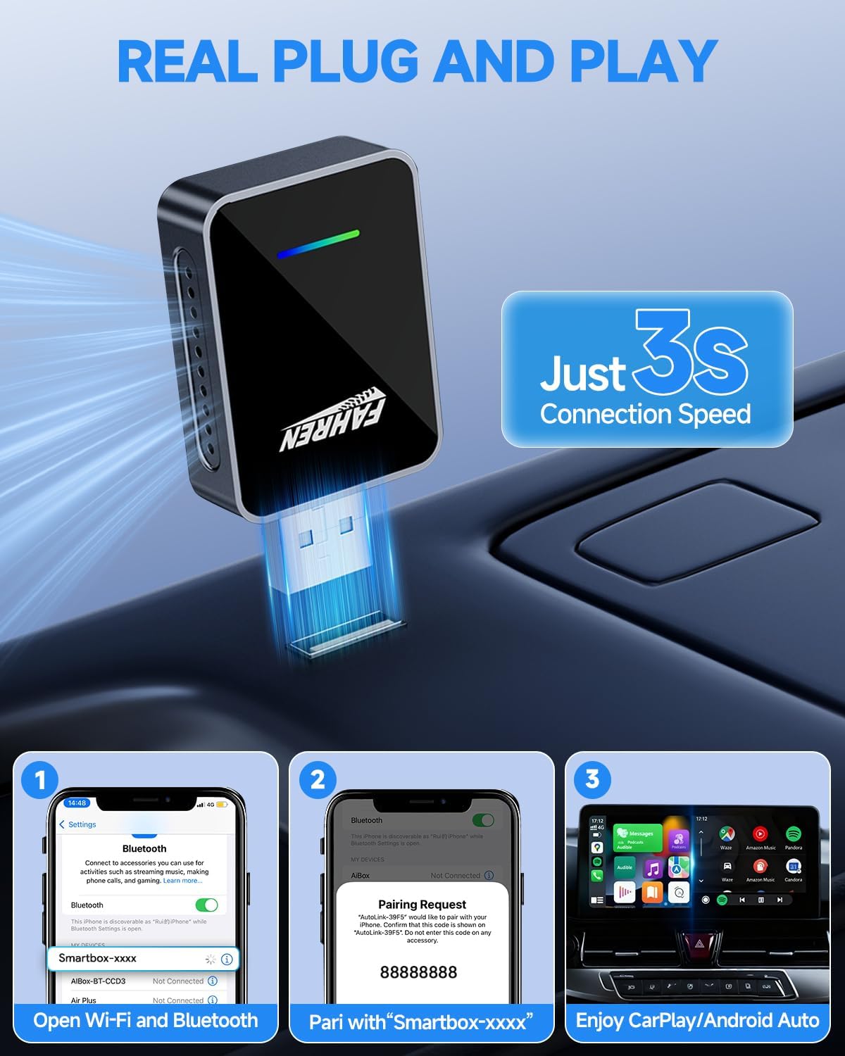 【Quick Connection, Long-lasting Durability】FAHREN newest wireless android auto adapter pairs in a lightning-quick 3 seconds—stable, lag-free, and drop-out proof. Pair once, and it auto-connects the second you hop in the car, delivering a top-tier driving experience.No matter the environment, this wireless carplay adapter for iphone stays consistent and reliable, mile after mile.