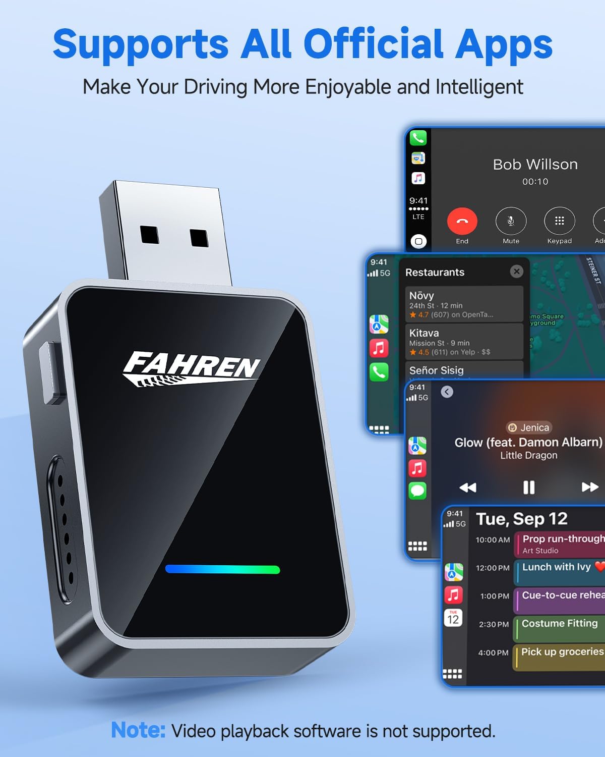 I purchased the FAHREN 2026 wireless adapter hoping it would provide a smooth wireless connection between my iPhone and my car’s infotainment system. The setup was simple and the device connected fairly quickly, which was a good start.However, the performance didn’t meet my expectations. I experienced noticeable lag when navigating apps and using the system. Making calls through the adapter was also frustrating because the audio would sometimes delay or cut out, making it difficult to have smooth conversations.Watching videos or streaming content online was also inconsistent, with buffering and occasional freezing that made the experience less enjoyable.Overall, while the concept is great and the device is easy to install, my experience was not a 10/10 due to the lag and connectivity issues. It has potential, but the performance could definitely be improved.