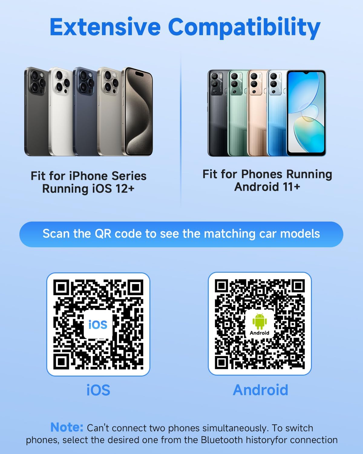 【Lightning-Fast Pairing & Dependable Durability】This universal carplay wireless adapter for apple phone works with 2016+ car models and supports iOS 12+ / Android 11+. Includes a USB-C adapter and 24-month warranty for total peace of mind.If you are unsure whether it is compatible with your car model, please contact us.