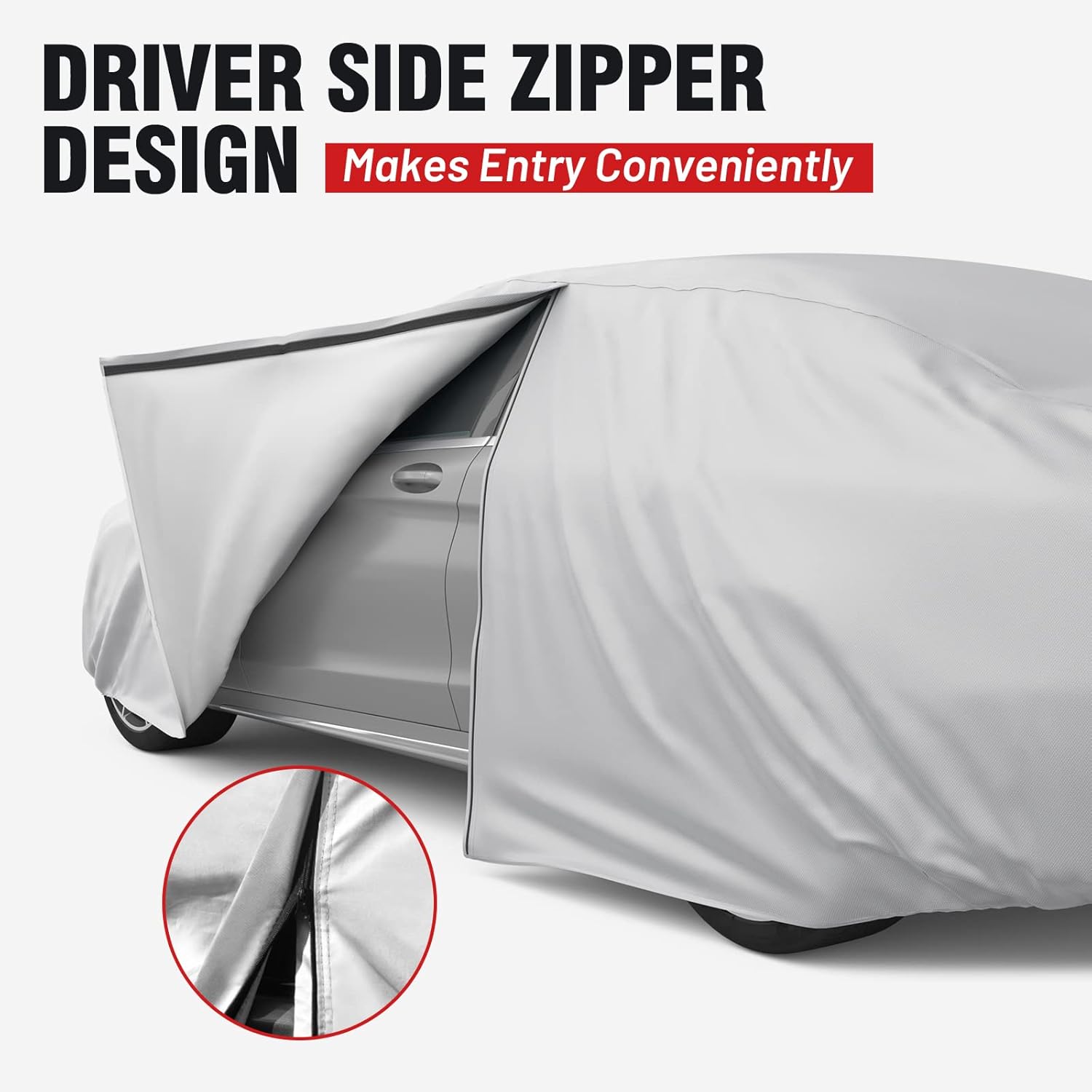 【Driver Side Zipper Design】- On the driver side, there is a zipper design on the car cover for easy entry. It is convenient for you to get into the car just in case it is already covered. Easy in and out without taking off the cover.