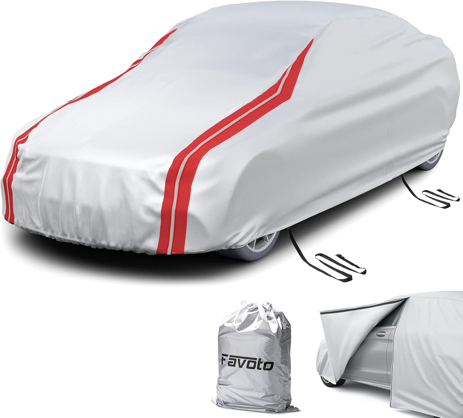 【Reflective Strips】- This outdoor car cover is designed with 4 reflective strips for increased visibility and safety. The two long strips on the front and two short strips on the back provide enhanced visibility during low-light conditions.