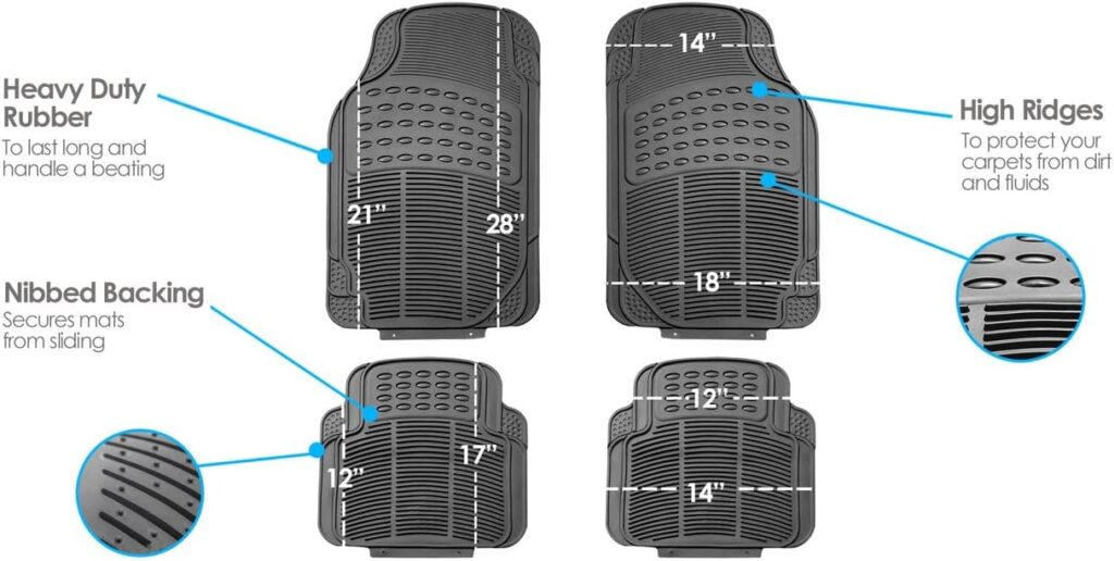 🚘 Trimmable design to fit your vehicle for ultimate protection; Heavy nibbed backing secures mats in place; Waterproof and stain-resistant