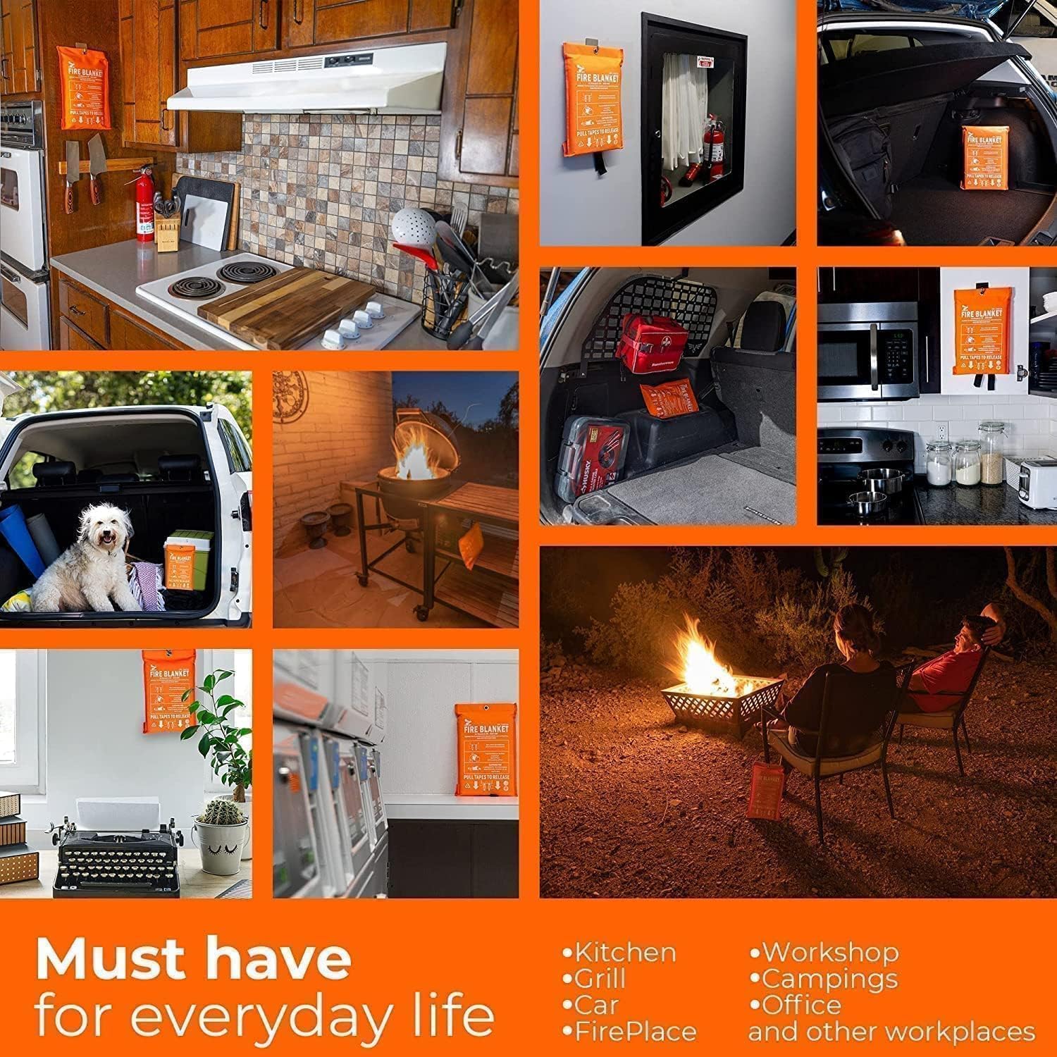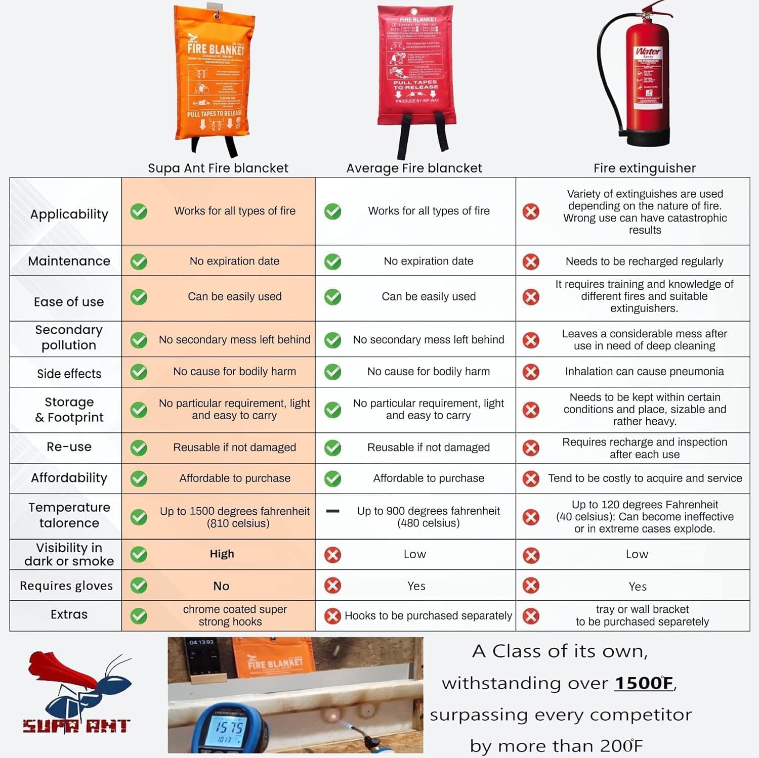 Superior Quality: Made of 500GSM and 0.5 mm thick flame retardant fabric as opposed to the market average of 430 GSM,Supa Ant emergency fire blanket is the highest quality, thickest in the market and has the highest fire resistance than any other fire extinguishers, safety blanket, fire blankets emergency for home and kitchen or car fire extinguisher of this kind. This fireproof blanket is the ultimate must have survival gear and supplies from the camping kitchen in your next car camping to kitchen fire blanket in your house,office, RV and camper van.