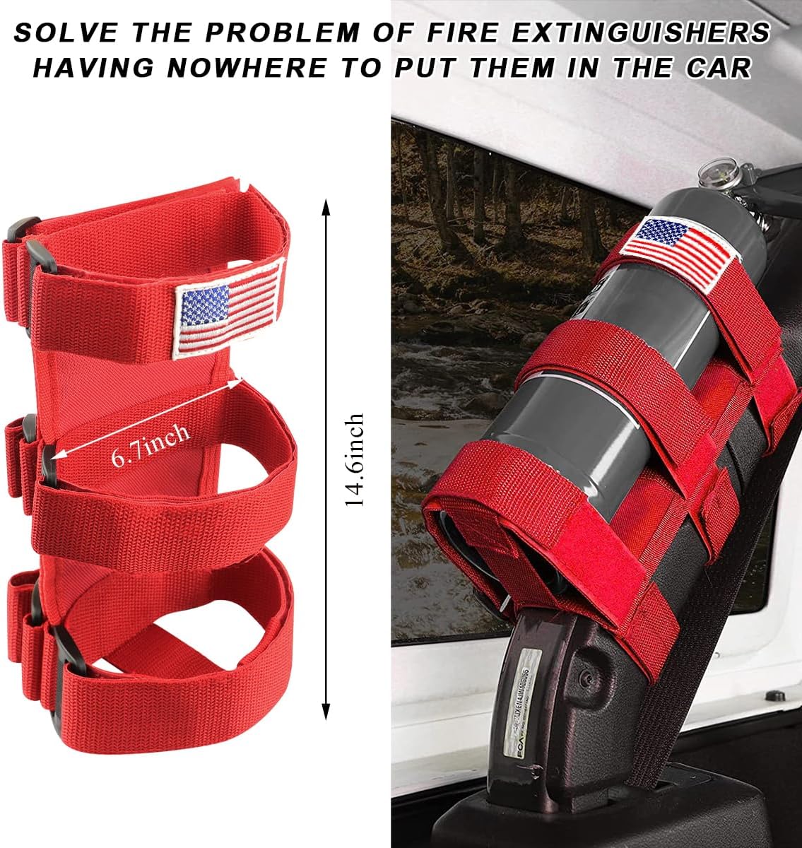 Fire Extinguisher Holder, Adjustable Extinguisher Fixed Belt with American Flag Pattern, Roll Bar Fire Extinguisher Mount Strap Bracket for Wrangler JK JKU TJ CJ Gladiator (Red)