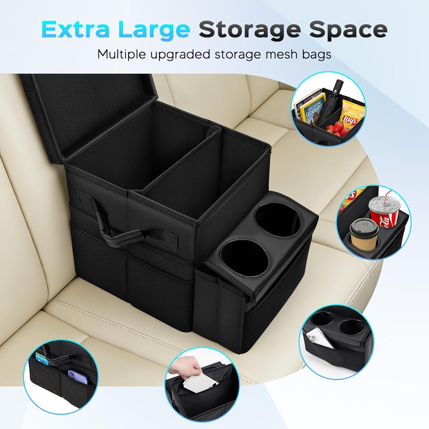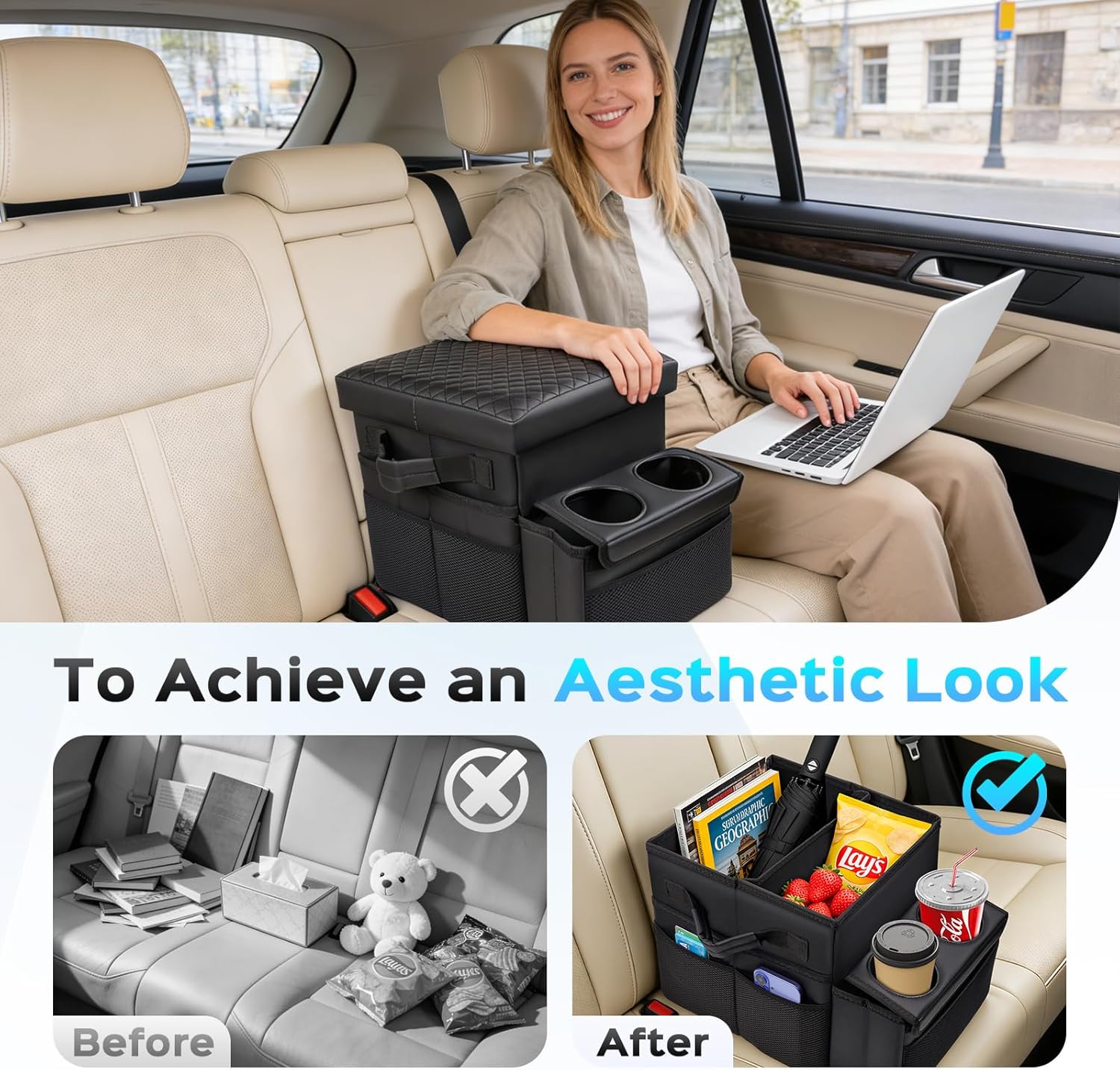 【Massive Armrest Storage Box】Clutter-free in seconds. Features an extra-large main compartment and 3 mesh pockets for phones, sunglasses, snacks, and essentials. Keep items neatly organized and within easy reach—no more rummaging. Transform your messy back seat into a tidy space for daily drives or road trips.