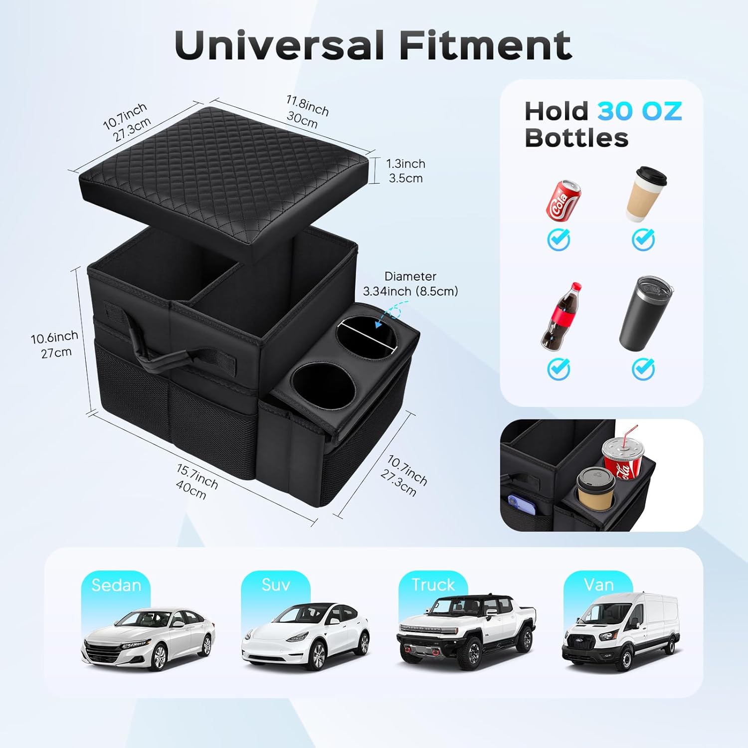 Foldable Bench Seat Center Console, Car Armrest Organizer Box with 2 Large Cup Holders & Massive Storage, Universal Portable Trunk Console Arm Rest for Car/Truck/Van/SUV Rear Organizers Back Seat