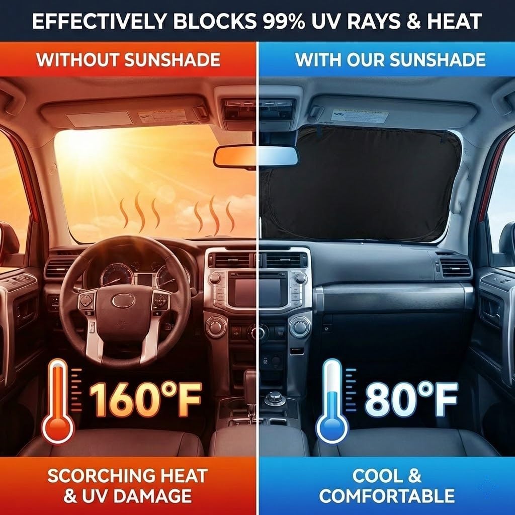 HEAT REDUCTION: Effectively shields your vehicle’s interior from direct sunlight, keeping the dashboard, seats, and steering wheel cooler during hot weather