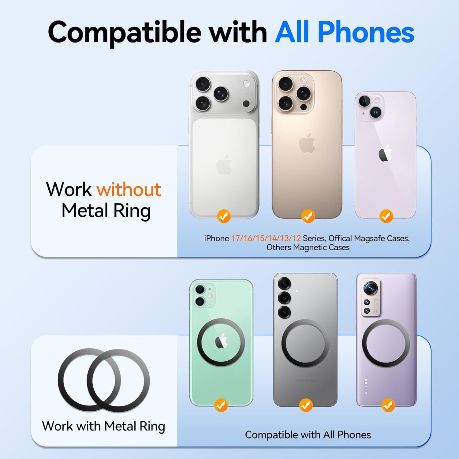 【MagSafe Compatible & Universal Compatibility】Exclusively optimized for MagSafe, this car vent phone holder works directly with iPhone 12, 13, 14, 15, 16, 17 Pro Max and all MagSafe-compatible cases. Other smartphones can use the included magnetic rings for a strong magnetic hold. This car mount fits 99.99% of car air vents and most mobile phones.