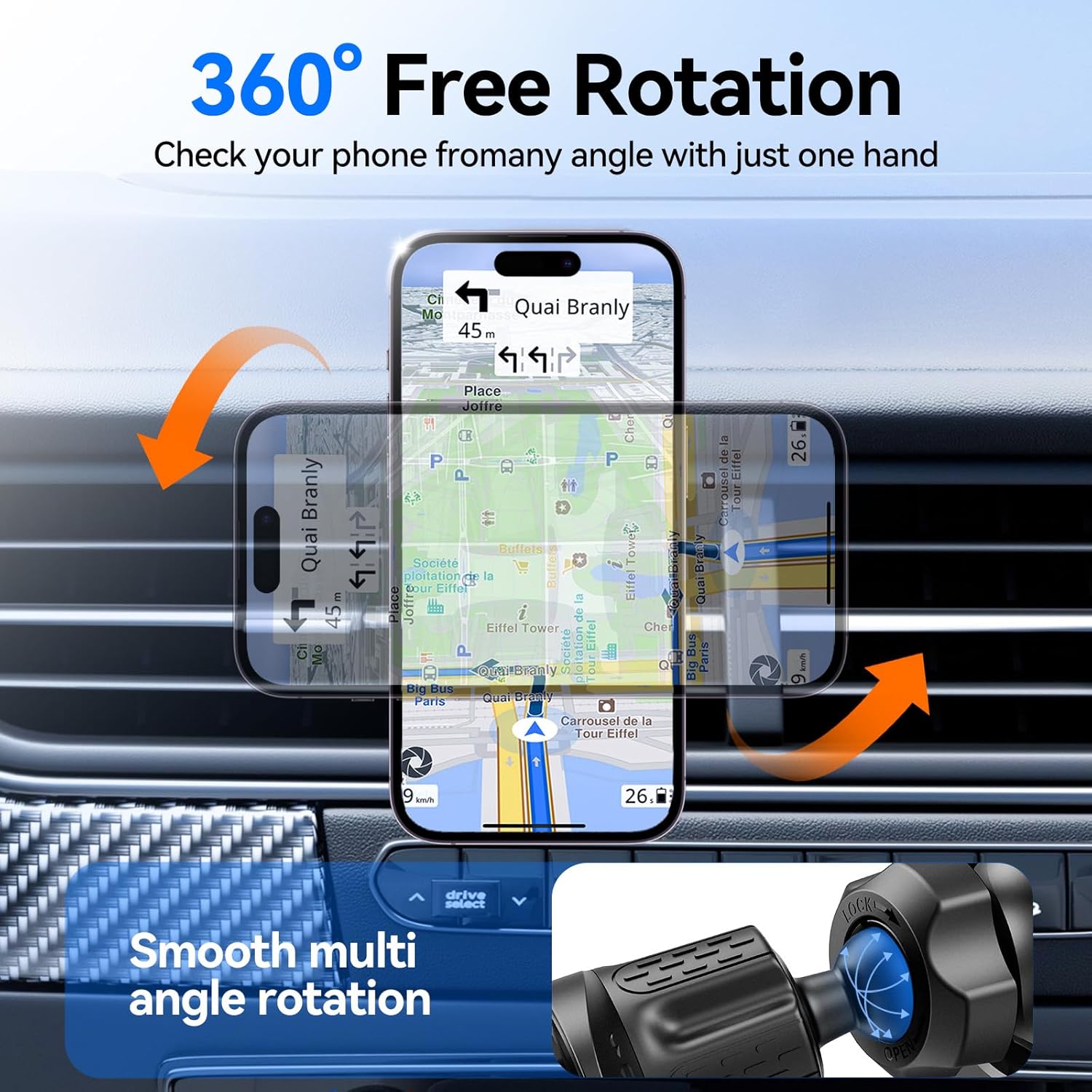 【One-Handed Operation & 360°Adjustable Viewing】Simply place your phone on the mount for instant one-handed operation. The 360° rotating ball joint allows flexible switching between portrait and landscape modes without blocking your driving view, air vent airflow, or phone signal.
