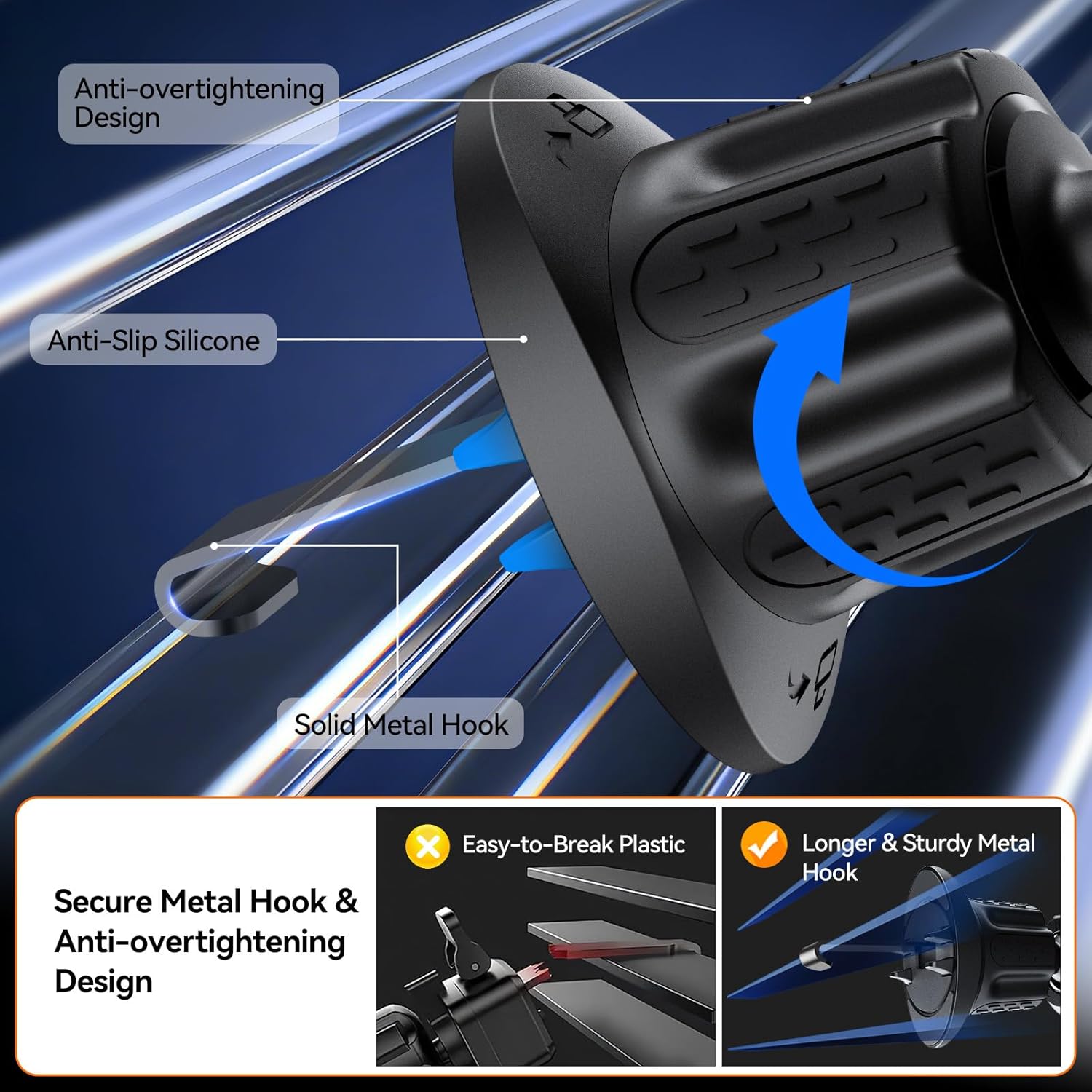 【Vent Protection & Durable Premium Design】The adjustable locking knob prevents over-tightening and protects your car air vent from scratches and damage. Constructed with a sturdy metal hook instead of fragile plastic, this car phone holder is more durable, safer, and more reliable than standard mounts, with quality visible in every detail.