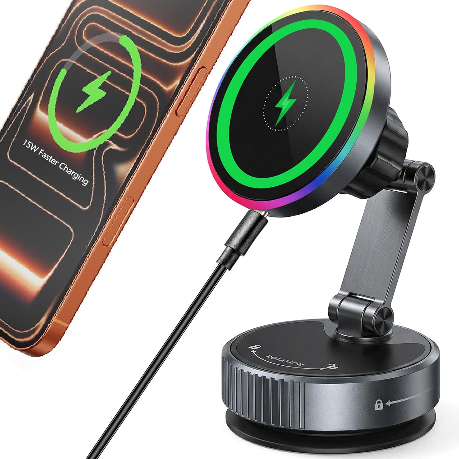 for MagSafe Car Mount Charger, 15W Fast Wireless Charging, Vacuum Suction Magnetic Car Phone Holder for iPhone & Android, 360° Adjustable Cell Phone Holders for Your Car Dashboard/Windshield