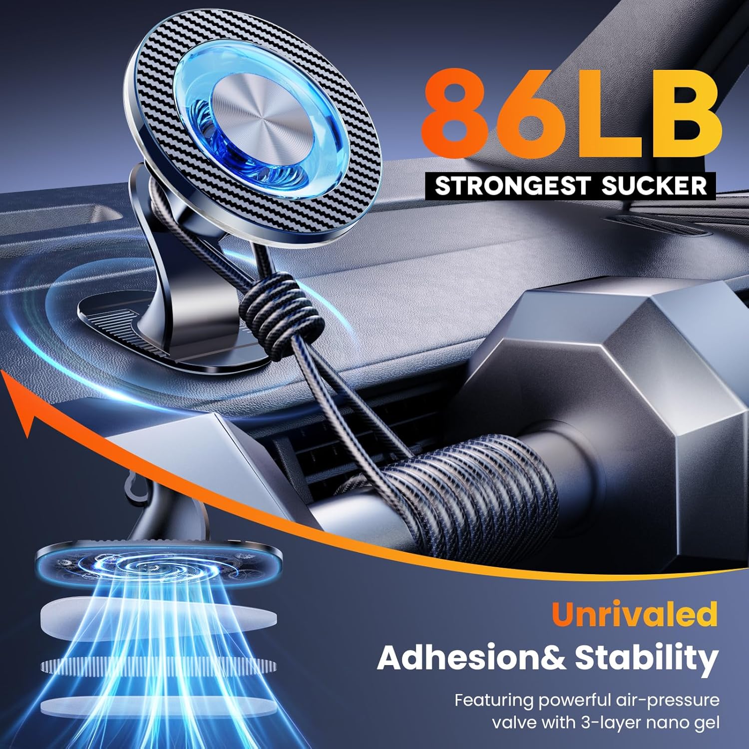 【THE MR. RIGHT OF SUCTION POWER FOR YOUR CAR】 The right fit is the best fit. Based on extensive lab testing data and real using feedback from millions of customers, we we designed and created this magnetic car holder with suction power that perfectly aligns with user experience. The upgraded 3M adhesive pad mount features 86 lbs (The most suitable suction threshold as determined by testing) of suction power, ensuring maximum suction while also providing maximum protection for your dashboard surface.