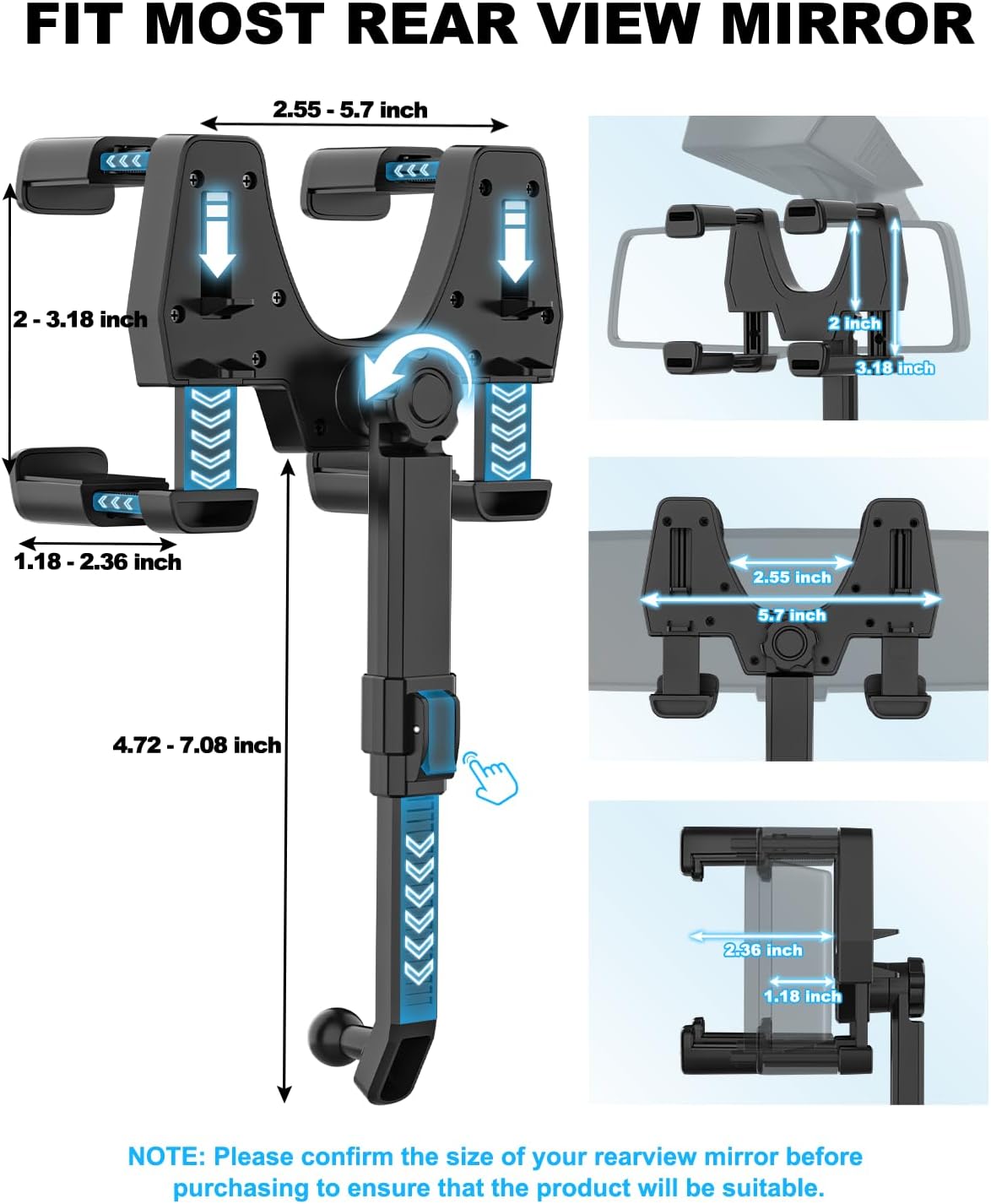 【Multi-tooth Groove Fixed Base】The base of the mobile phone holder for automotive rearview mirrors has a multi-alveolar design that can be adjusted and adapted for mirrors with a thickness of 1.18-2.36 inches (29mm-59mm)and a width of 2-3.18 inches(50mm-80mm).