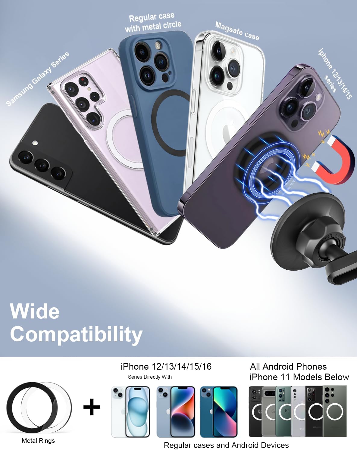 【Broad Compatibility】The magnetic phone mount with strong force that can fit all 4-7” cell phones such as iPhone 17, iPhone Air, iPhone 17 Pro, iPhone 17 Pro Max, iPhone 16, iPhone 16 Plus, iPhone 16 Pro, iPhone 16 Pro Max, iPhone 15 Plus / Pro /Pro Max, iPhone 14 13 Pro Max, 12 Mini, Xs XR X 8 Plus 7 6s 6, Galaxy S24 23 22, Note 9, LG and other cell phones.