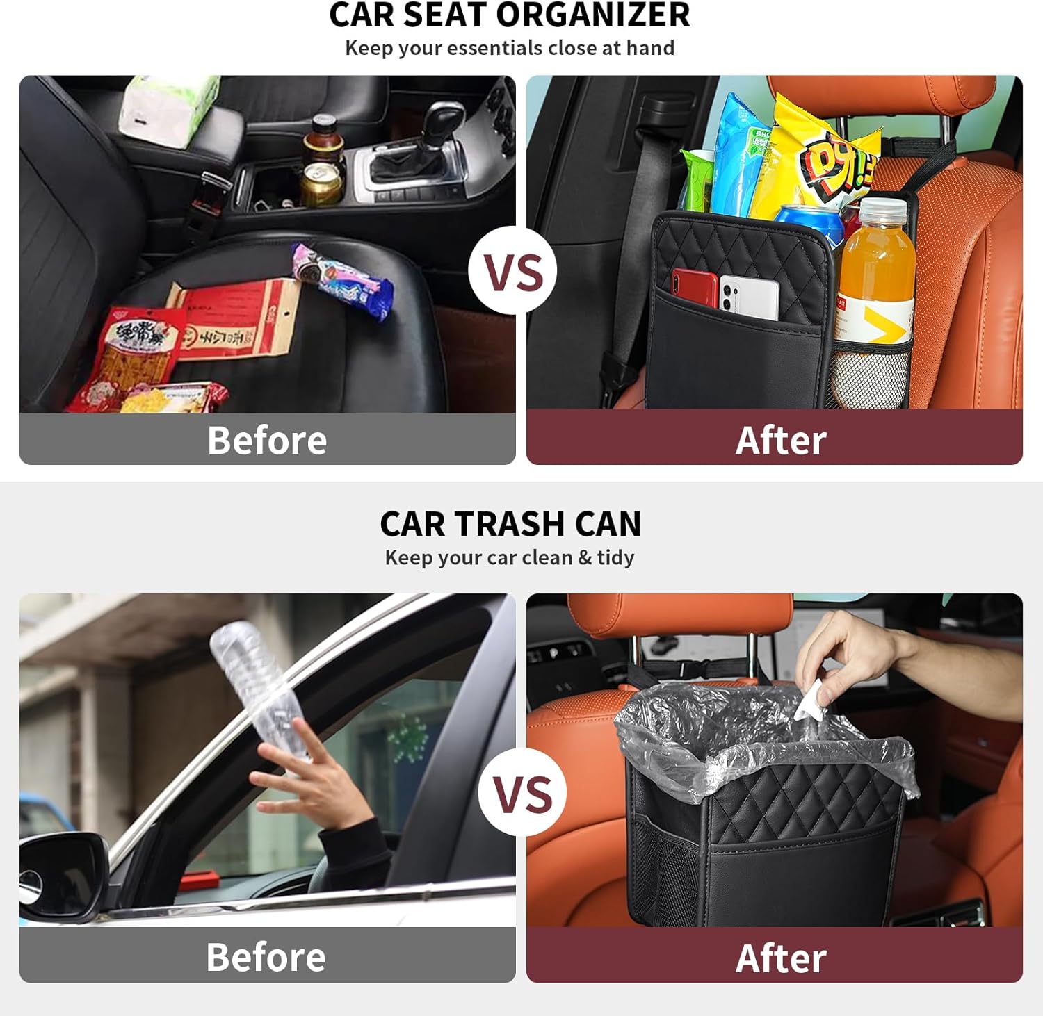 Premium PU Leather: Made of high-quality PU leather material, waterproof and leak-proof, just use a cleaning cloth to easily clean. Great backseat organizer for kids to keep your car tidy. Foldable Organizer: The car organizer takes up very little space in the car and can be easily folded into a compact size for storage when you not needed. With Cup Holder Design, Provide High Capacity Extra Storage Space for Your Cars VERSATILE CAR CONTAINER: The car organizer can store children’s toys, drinks, snacks, daily necessities, important documents, etc. It can also be used as a car trash can and travel storage bag EASY TO INSTALL: The car organizer has an elastic strap for easy fixation. It can be hung on the front or back of the car seat, hung on the armrest box, placed on the seat or floor.
