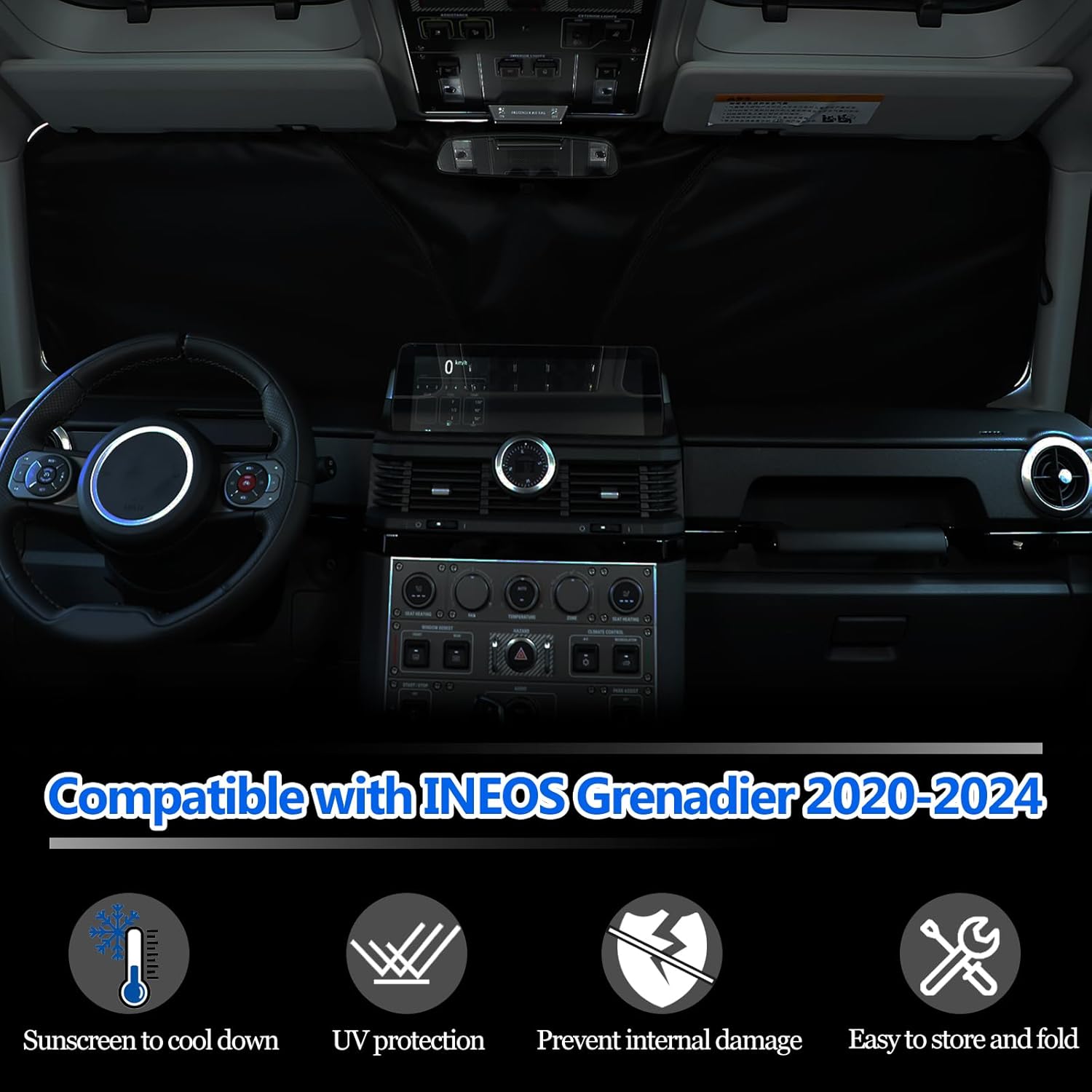 APPLICABLE MODEL: The front windshield sun shade is designed for INEOS Grenadier Station Wagon/ Quartermaster 2020 2021 2022 2023 2024 2025 2026 model, please check the car model carefully before ordering.