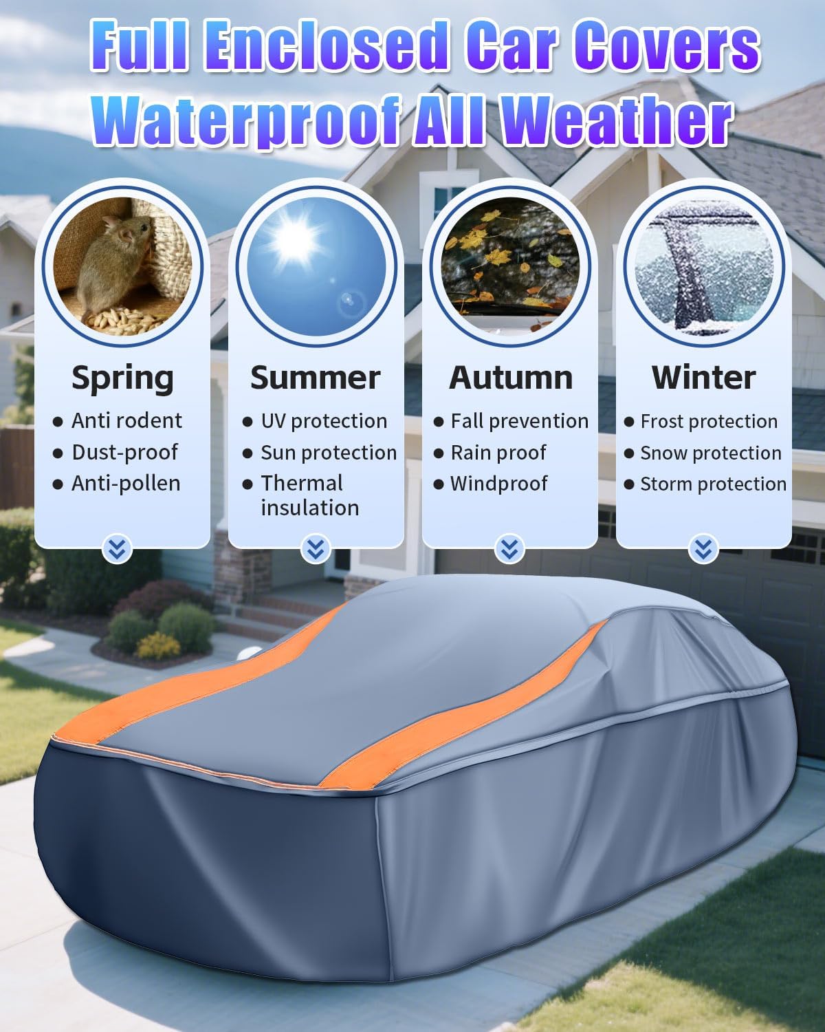【All Weather Car Covers】This car covers for automobiles all Weather waterproof can use for no matter outdoor or indoor, can use for 1.Spring-rodent proof,anti pollen,dust proof.2.Summer-Sun/UV protection, thermal insulation.3.Autumn-Prevent falling leaves, heavy rain proof, strong wind proof.4.Winter- Prevent frost/snow/storm.