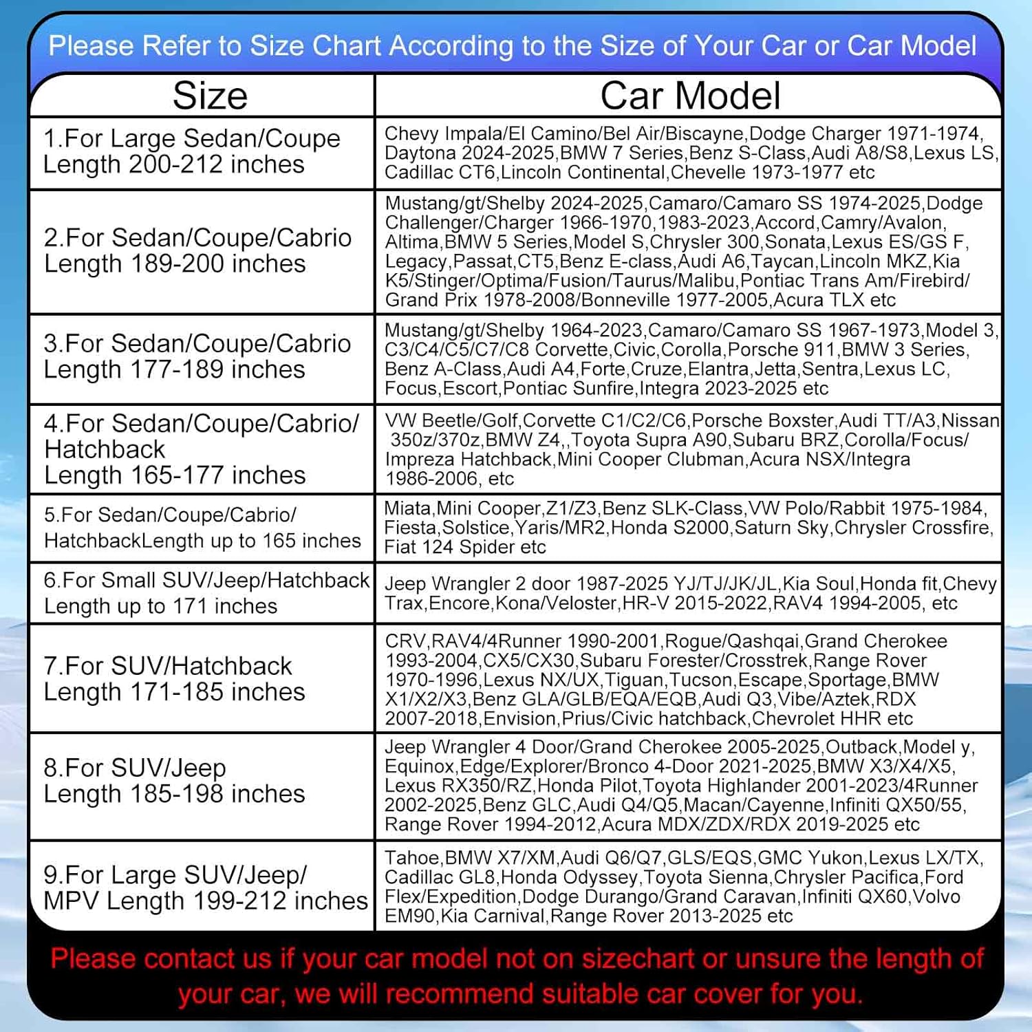 【Universal Fit for SUV/Jeep Length 185”-198”】This waterproof car cover size 198 “L x 94” W x 75″H,universal fit for Jeep Wrangler 4 Door/Grand Cherokee 2005-2025,Outback,Model y,Equinox,Edge/Explorer/Bronco 4-Door 2021-2025,BMW X3/X4/X5,Lexus RX350/RZ,Honda Pilot,Toyota Highlander 2001-2023/4Runner 2002-2025,Benz GLC,Audi Q4/Q5,Macan/Cayenne,Infiniti QX50/55,MDX/ZDX/RDX 2019-2025 etc, there is also other size car cover fit for most automobiles in TAJSJNG store, please message us your make/model for a custom recommendation!