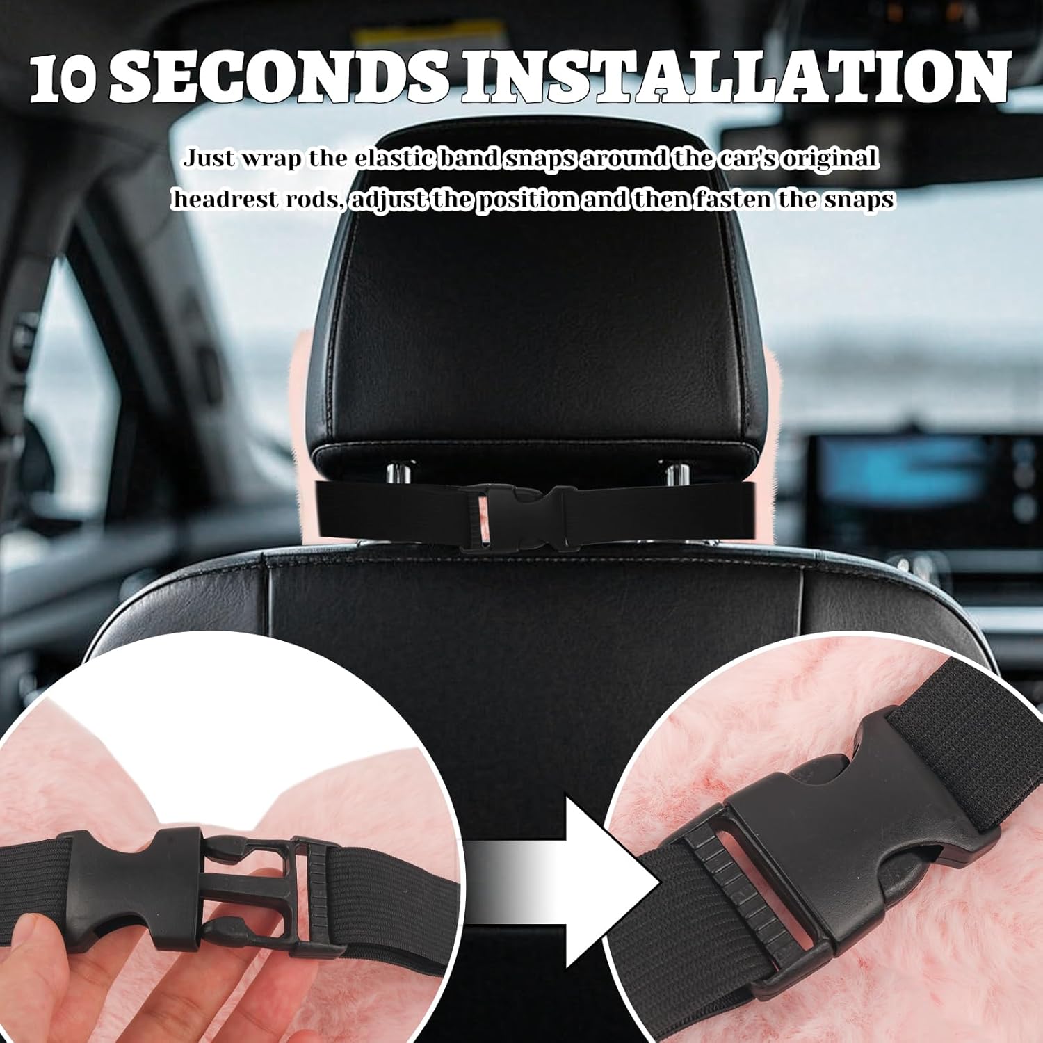 10 SECONDS INSTALLATION: The back of the car seat neck support is designed with elastic band snaps, super easy to install: just wrap the elastic band snaps around the car’s original headrest rods, adjust the position and then fasten the snaps
