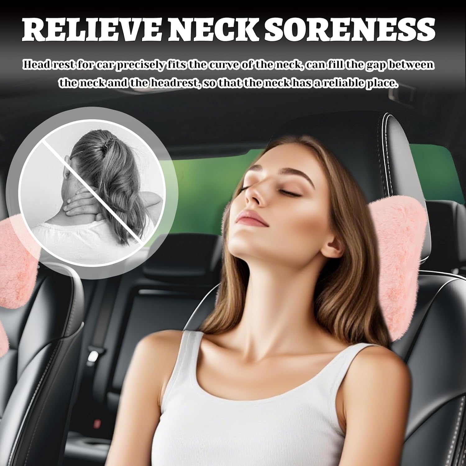 RELIEVE NECK SORENESS: Head rest for car precisely fits the curve of the neck, can fill the gap between the neck and the headrest, so that the neck has a reliable place. When driving for a long time, it effectively disperses the pressure on the neck and relieves fatigue and soreness