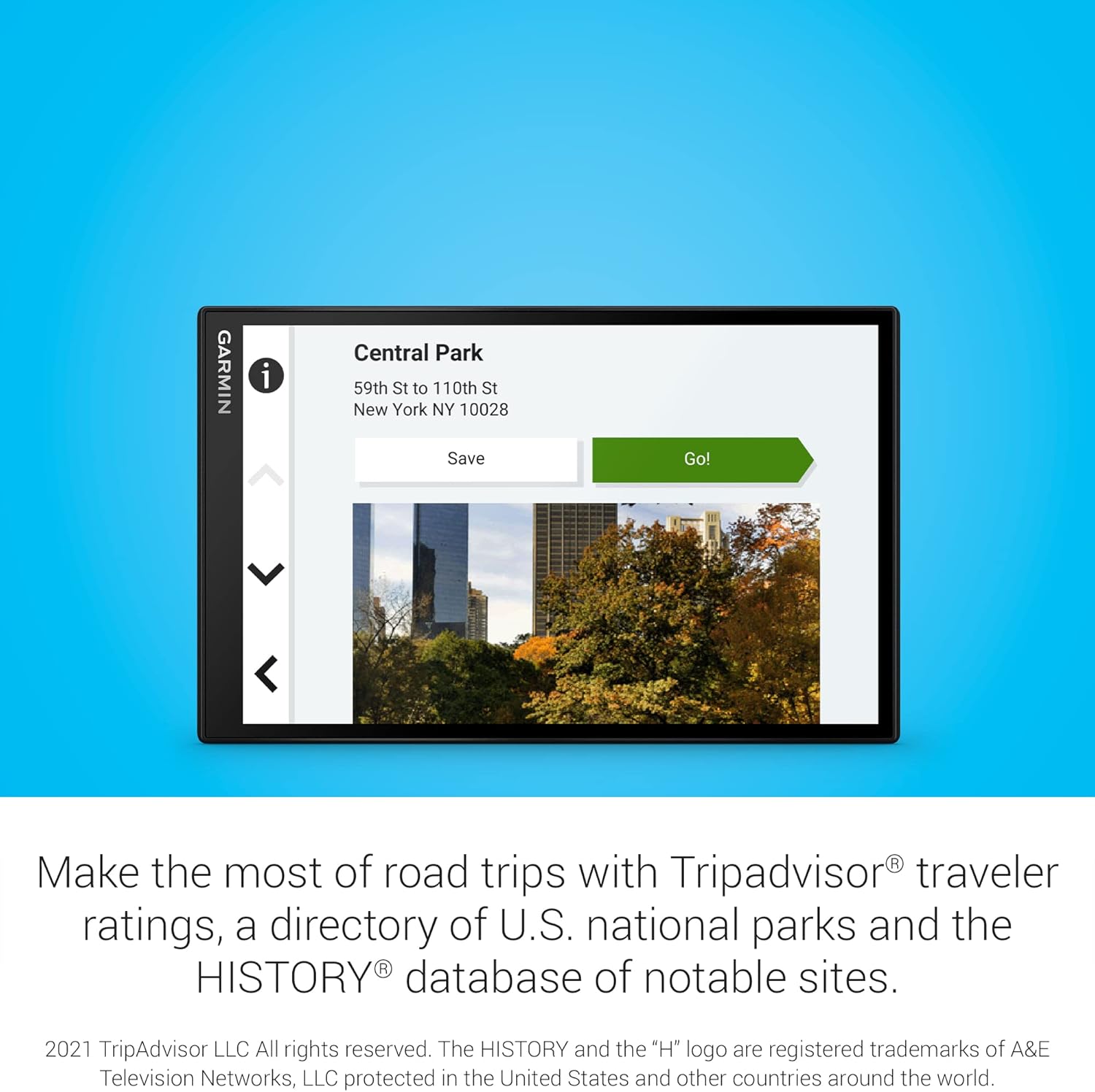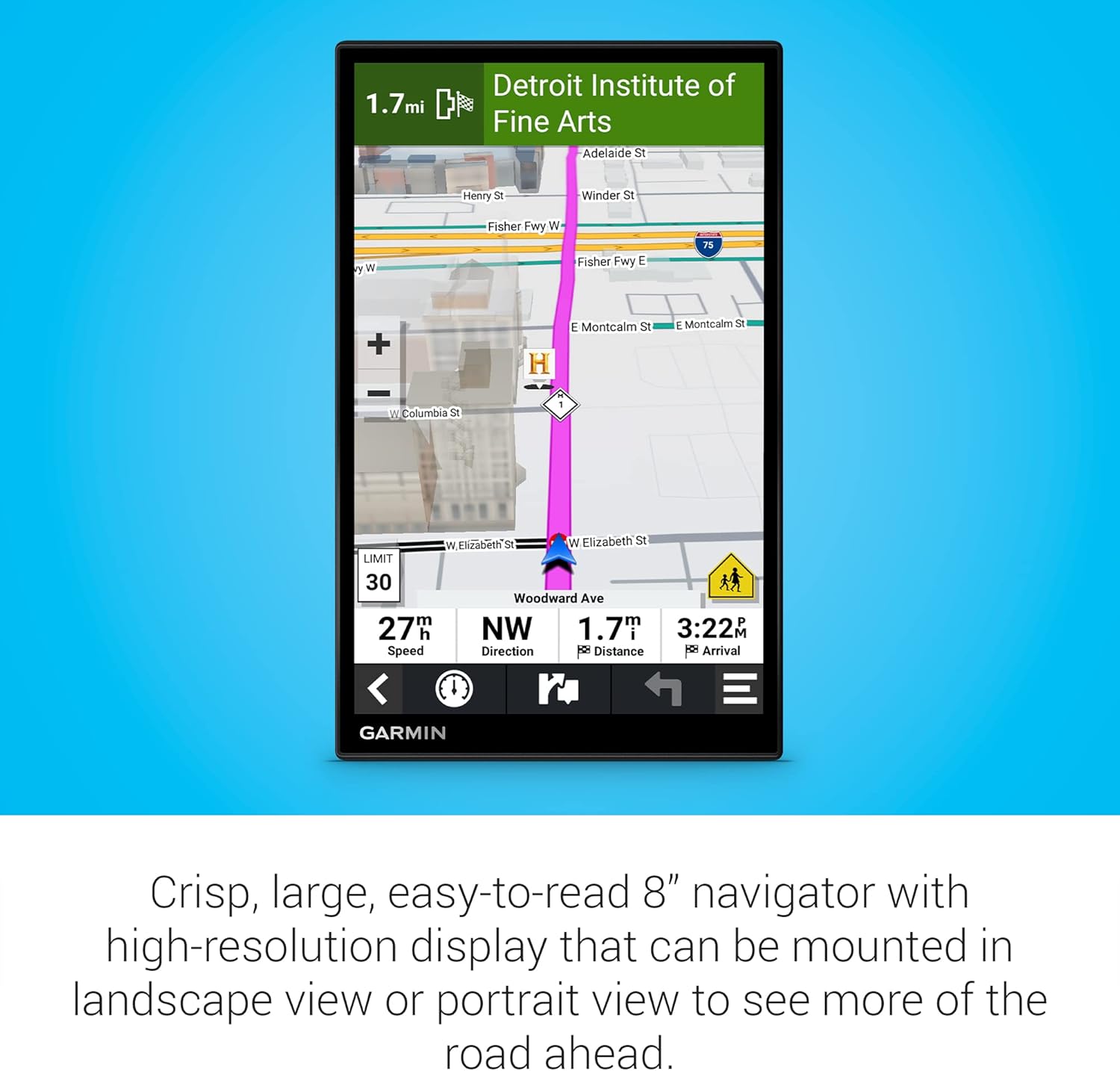 8” navigator with high-resolution, dual-orientation display and map updates of North America .Special Feature:Large Display; Voice Assist; Hands-Free Calling; Live Traffic and Weather; Traffic Cams and Parking; Smart Notifications,Driver Alerts; Tripadvisor; National Parks Directory; Find Places by Name; Garmin Real Directions Feature.