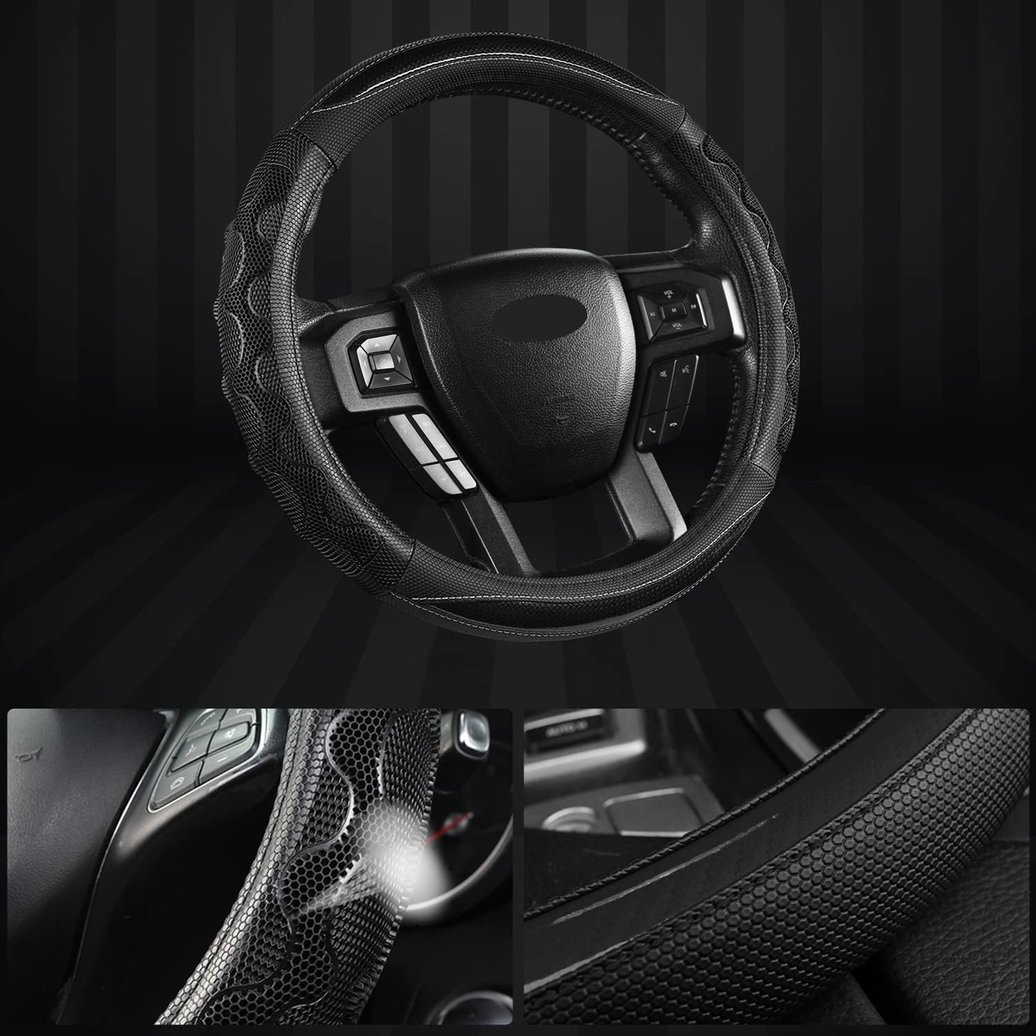 ✈️【PREMIUM MATERIAL】 This steering wheel cover is made of PVC leather with honeycomb breathable hole, it can greatly reduce the hand sweat to increase comfort. It is wear-resistant and durable.