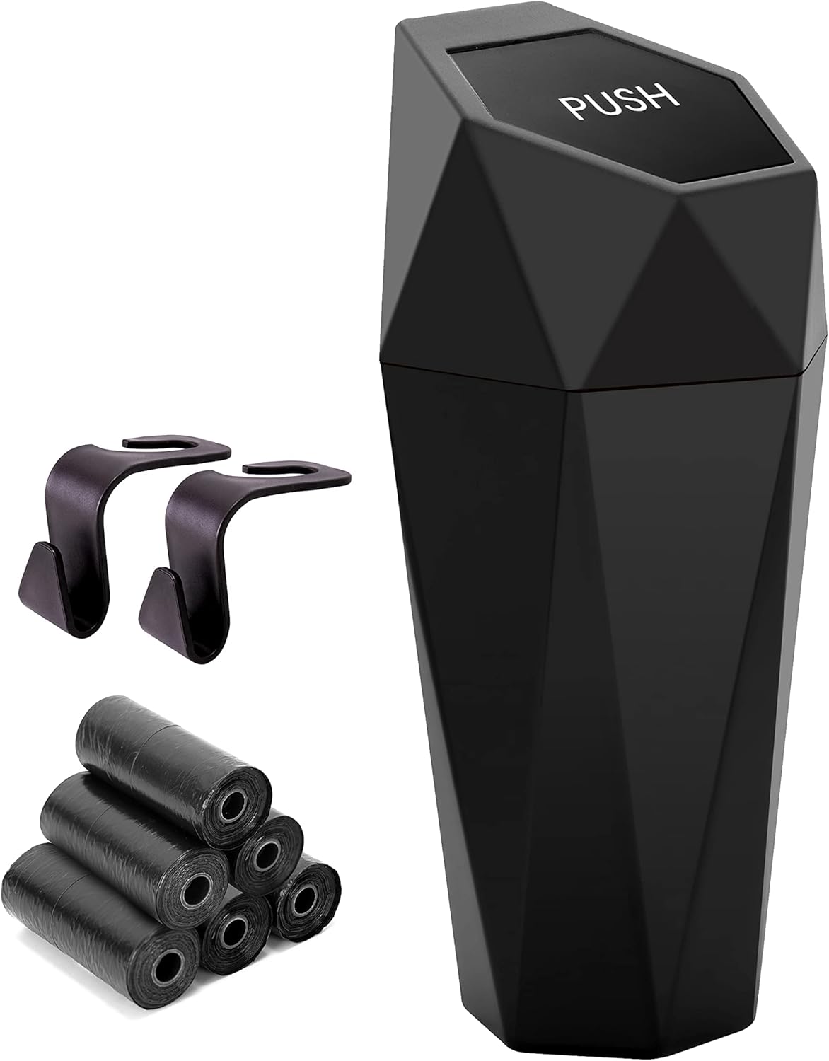 These little car trash cans are such a smart buy! I keep mine in the side doors, and they fit perfectly. They also come with a bunch of mini trash bags, which was a nice surprise and super convenient. The push-door lid works really well—easy to use and keeps everything tucked away neatly.They’re great for small trash like straw wrappers, receipts, or anything you usually toss into your cup holder or console. I just fill mine up and empty it whenever I stop for gas—it’s made it so much easier to keep my car clean and organized.As a bonus, I didn’t even realize they came with seat-back hooks for hanging bags or purses. That was a nice extra I wasn’t expecting! I’m honestly considering getting a second set just to have more of those hooks, and to make sure everyone in my car has a spot for their trash—no excuses!Overall, these are super cute, discreet, and functional. Definitely recommend if you’re trying to keep your car tidy without sacrificing style.