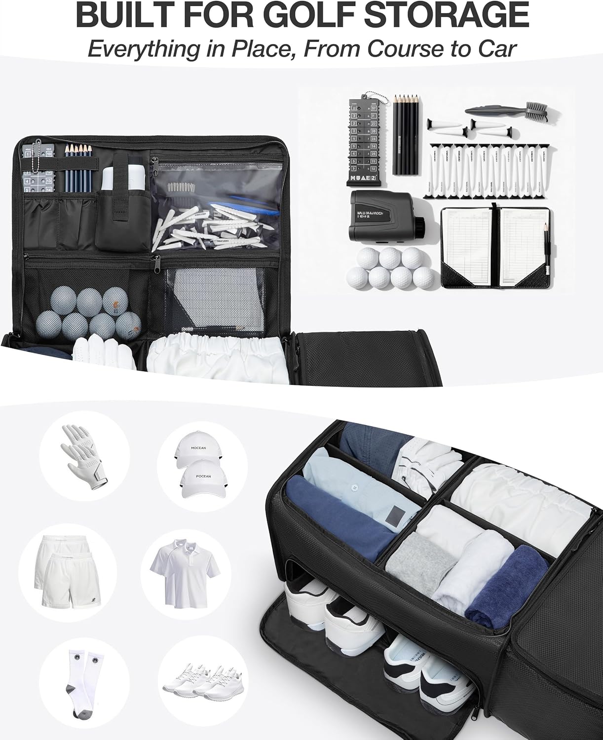 𝐀𝐥𝐥-𝐈𝐧-𝐎𝐧𝐞 𝐆𝐨𝐥𝐟 𝐒𝐭𝐨𝐫𝐚𝐠𝐞: Spacious main compartment for golf gloves, towels, shirts and gear. Multiple lid pockets keep tees, balls, scorecards and pens neatly organized.