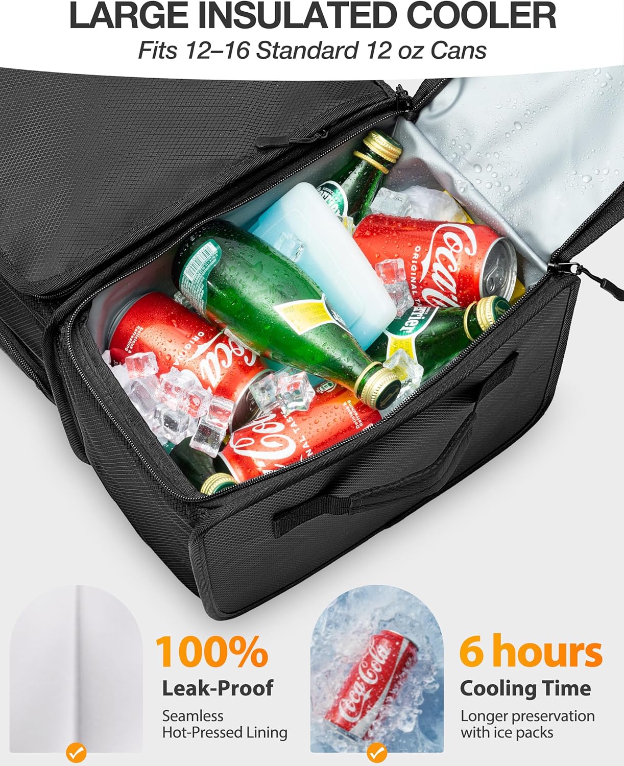 𝐈𝐧𝐬𝐮𝐥𝐚𝐭𝐞𝐝 𝐂𝐨𝐨𝐥𝐞𝐫 𝐂𝐨𝐦𝐩𝐚𝐫𝐭𝐦𝐞𝐧𝐭: Fits 12–16 standard 12oz cans. Keeps contents cool up to 6 hours (tested at 86°F with ice packs). Fully waterproof lining helps prevent leaks.