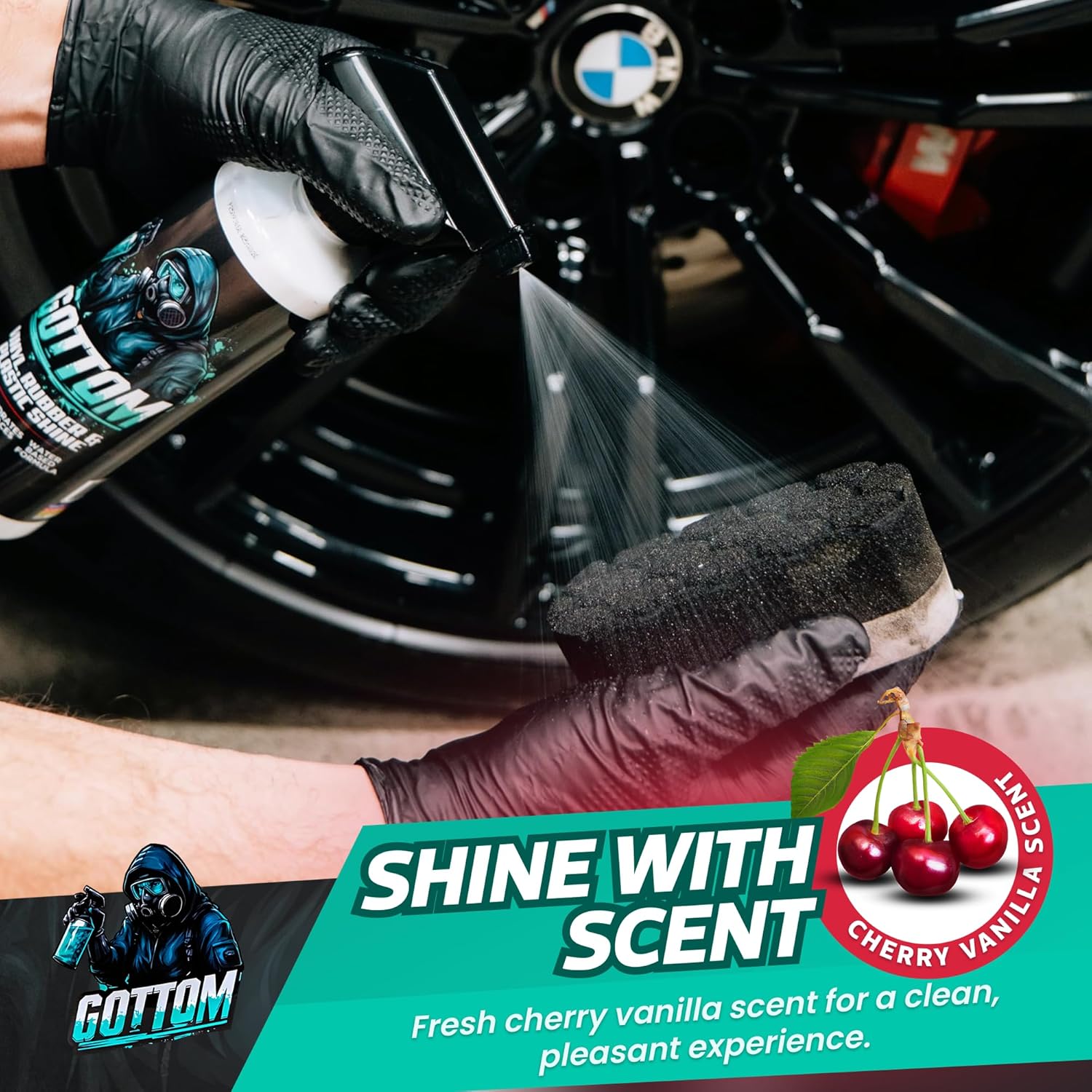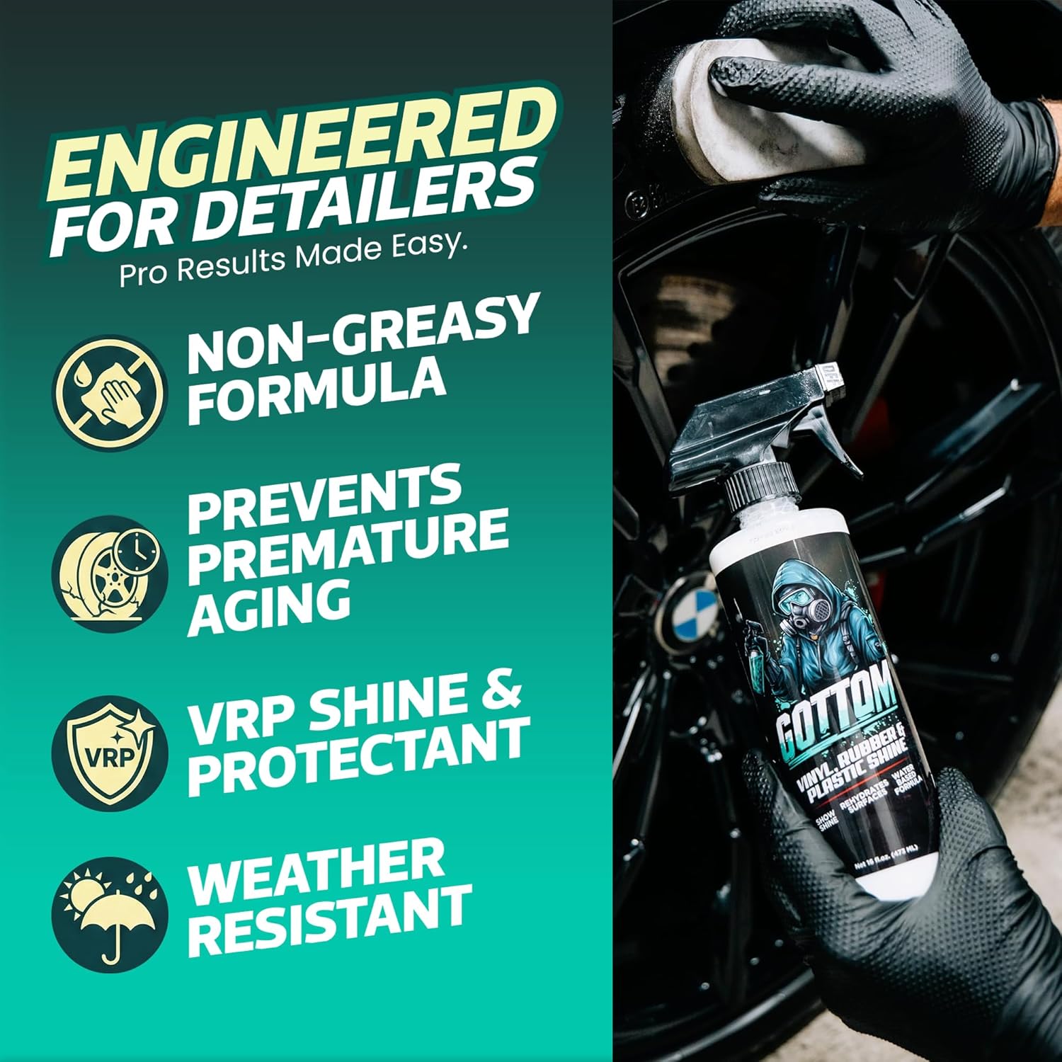 TIRE DRESSING & PLASTIC RESTORER: Gottom works as both a tire dressing and a plastic restorer, restoring a glossy finish to tires and exterior plastic parts, while protecting them from fading, cracking, and discoloration from UV rays.