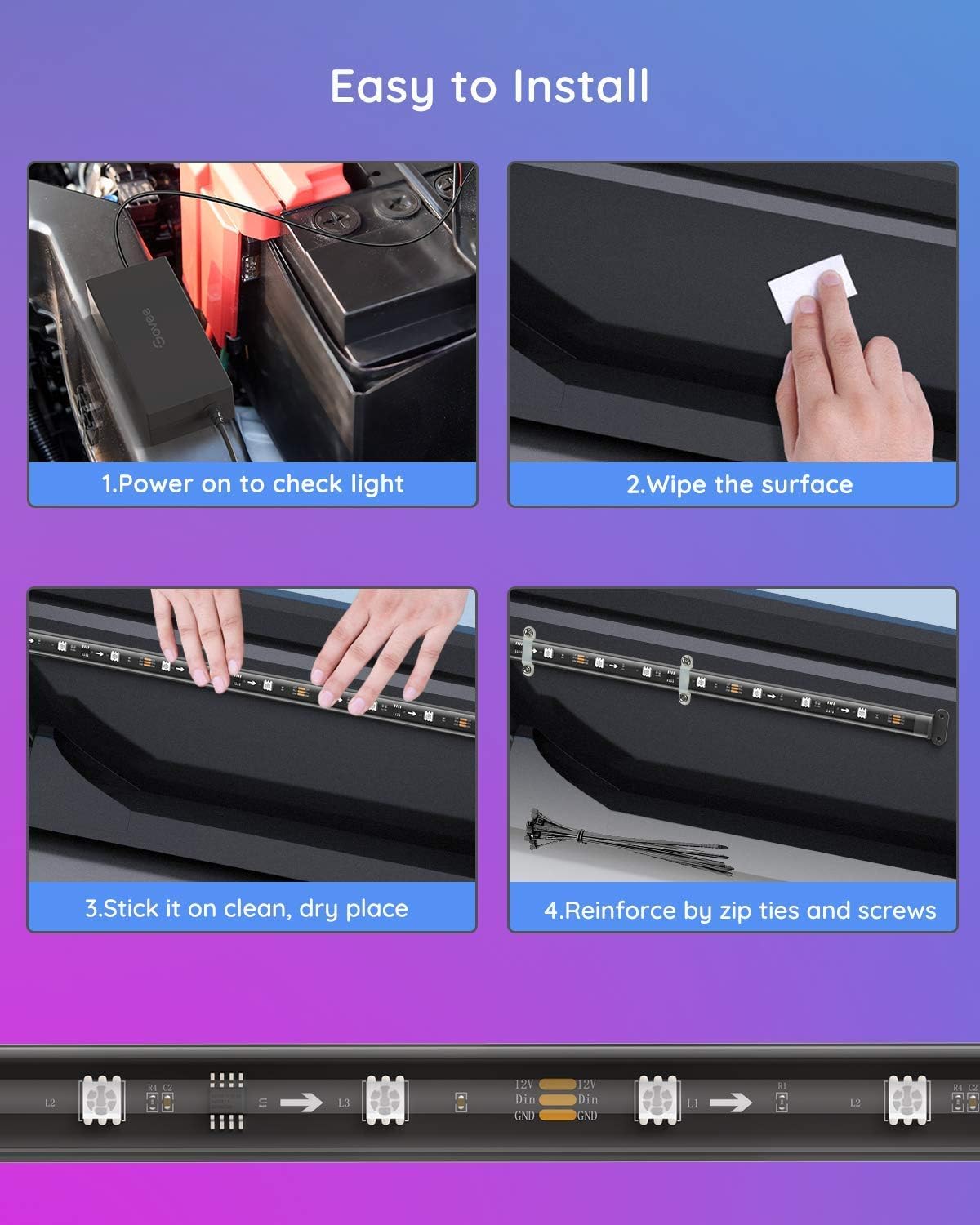 Simple Installation: With a total length of 2x(2.9ft+3.9ft), the 2-line design and long wires make it simple to install LED lights in your car. For added security, reinforce the lights using the provided adhesives, clips, and screws.