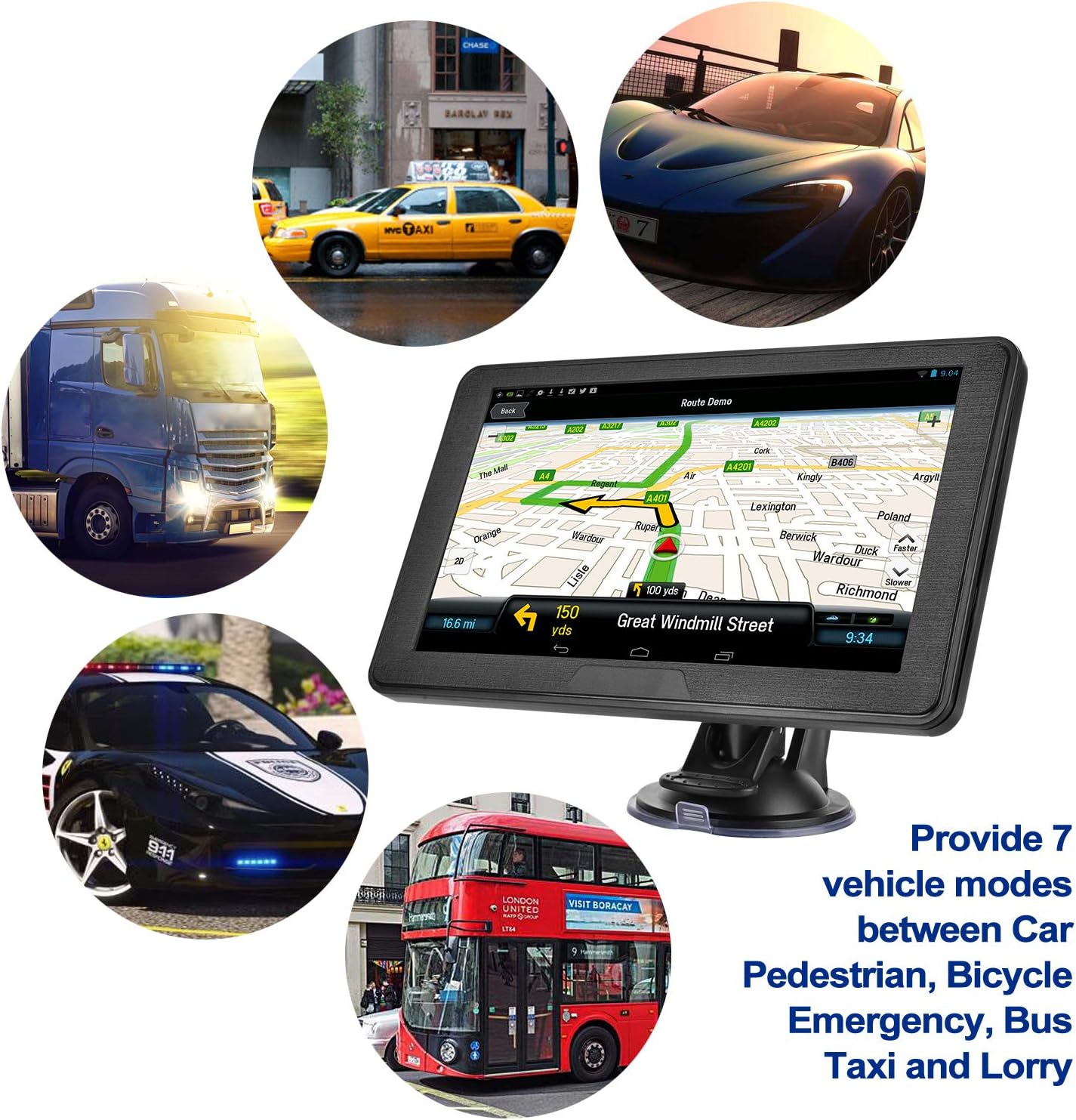 7inch bigger touch screen: Clearer screen display, which gives you a better visual experience.Real Voice Navigation:You do not have to stare at the screen all the time.Route Warnings for Truckers :Route warnings, including sharp curves,bridge America, plus Lifetime Map and Traffic updates. Includes trucker-heights, weight limits, steep grades and more friendly features like Custom Truck.Sunlight visibility: The included sunshade makes it easier to see your navigation, even in the harshest sunlight.