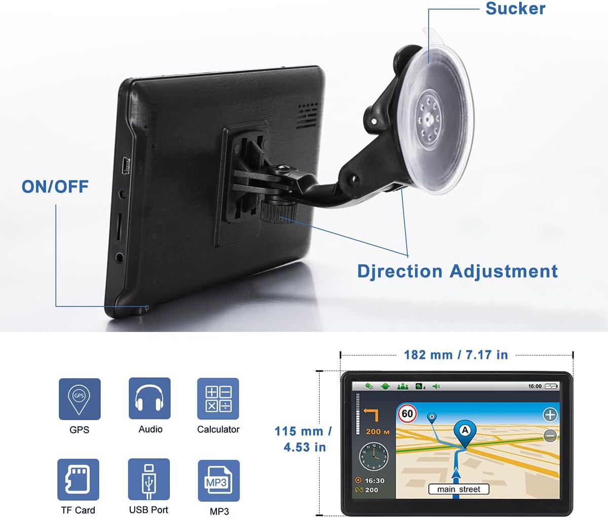 【Performance Upgrade】 7-Inch Large Screen Brings Better Visual Effects, using 3000mah Polymer Battery, 5v 2.5a -350cm Line Car Charger, CPU: Wince Mediatek2531. Built-in 16gb Rom 256mb Ram, Maximum Support 32g Extended Memory, Large Capacity Can Accommodate You Can Store Maps and Materials.