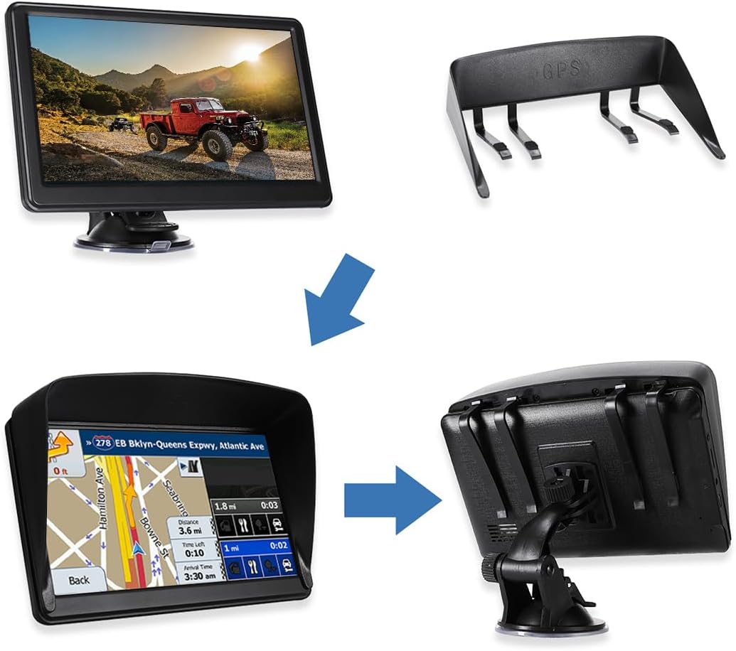 【Complete Kit – Ready to Install】 Includes all necessary accessories: GPS unit, car mount, sunshade visor, car charger, USB cable, and manual. Easy plug-and-play setup—ready to use right out of the box with intuitive touchscreen operation.