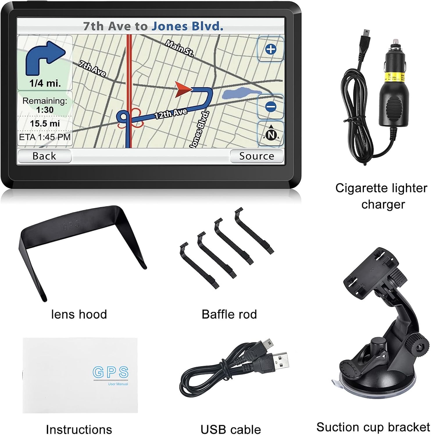 1 x 7″ Touch Screen GPS Navigation1 x Car Charger1 x MINI USB cable1 x User Manual1 x Car Bracket1 x Back Bracket1 x Sunshade