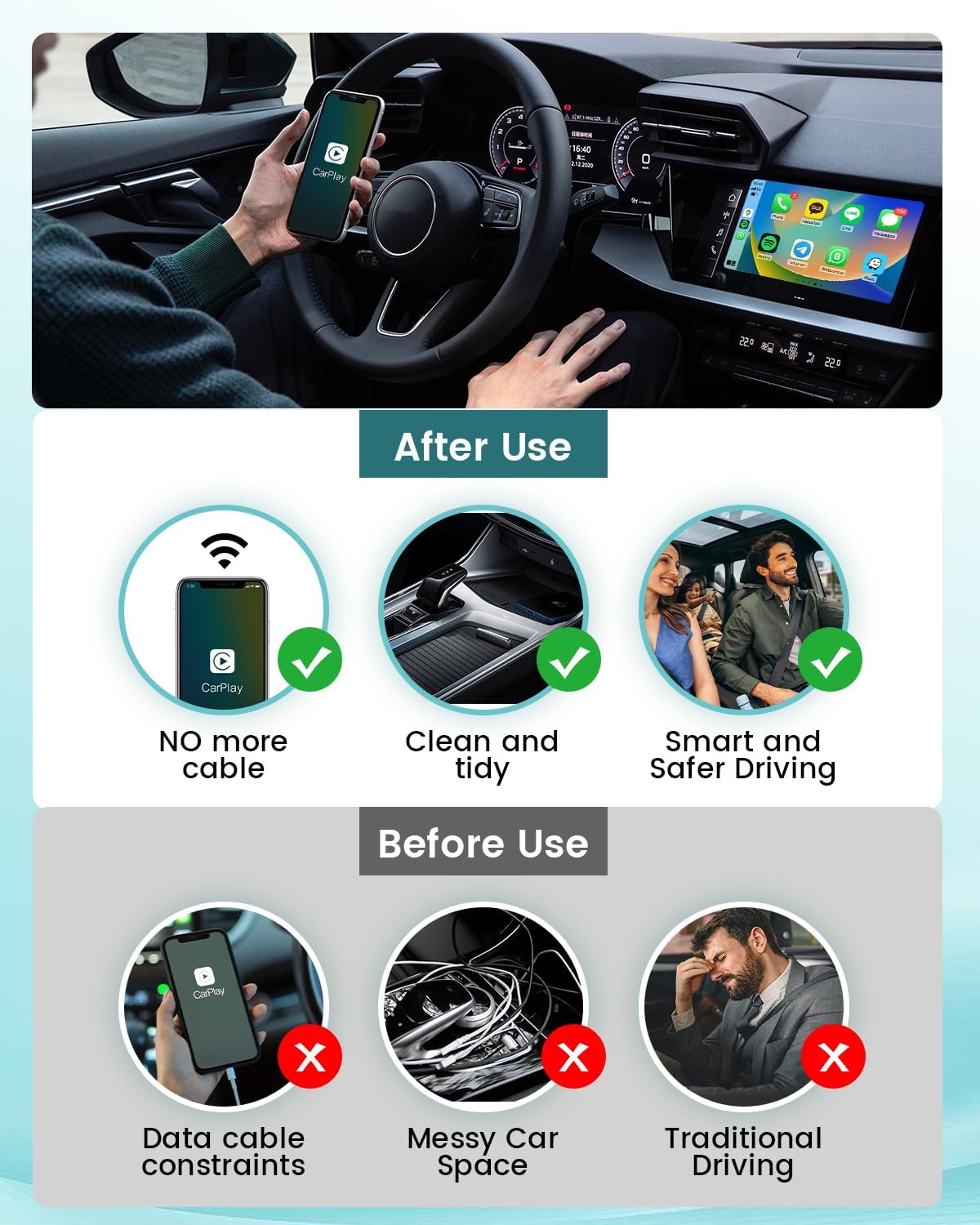 🚗 【BROAD VEHICLE & PHONE SUPPORT – WORKS LIKE FACTORY】 Designed for wide compatibility with vehicles already equipped with factory wired CarPlay or wired Android Auto (most 2016+). It works seamlessly with iPhones (iOS 10+) and compatible Android phones (Android 11+). But vehicles must be equipped with genuine wired CarPlay/Android Auto. Not applicable to vehicles without CarPlay/Android Auto.Crucially, it integrates perfectly, allowing you to retain full use of your factory touchscreen, steering wheel buttons, and voice assistant commands. Enjoy the wireless upgrade without losing the familiar, native control of your system.