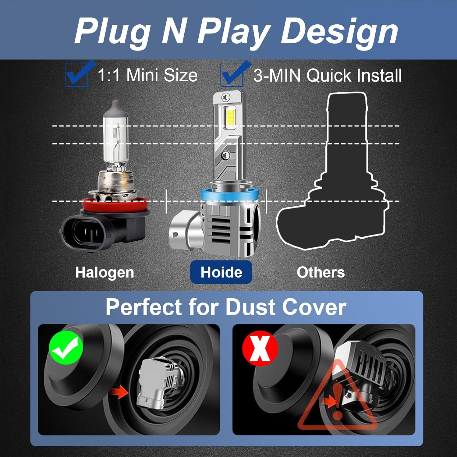 Authentic 1:1 Mini Design: Compared to other bulbs, 9005+H11 light bulbs 4 Pack eliminate bulky bases and extra drivers. After numerous tests and meticulous design, they achieve the optimal 1:1 size match with standard bulbs. The all-in-one design, with non-plastic connectors, ensures enhanced strength and durability.