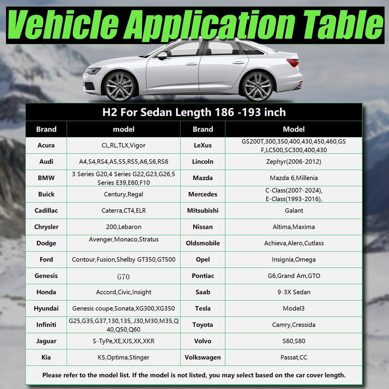 【Perfectly Compatible】-H2 suitable for Sedan/coupe/convertible. Length: 187 to 193 inches. (Not suitable for SUV). For example: Toyota Camry / Avalon, Honda Accord, Kia Stinger/Optima, Ford Mustang / Shelby, Chevrolet Camaro, Audi A6, BMW 5 Series/6 Series, Mercedes C Class / E Class, VW Passat / Sedan, Lexus ES / GS / SC / LC, etc.Please check our size chart before purchasing Unsure if it fits? Feel free to contact us and we’ll get back to you promptly with answers!