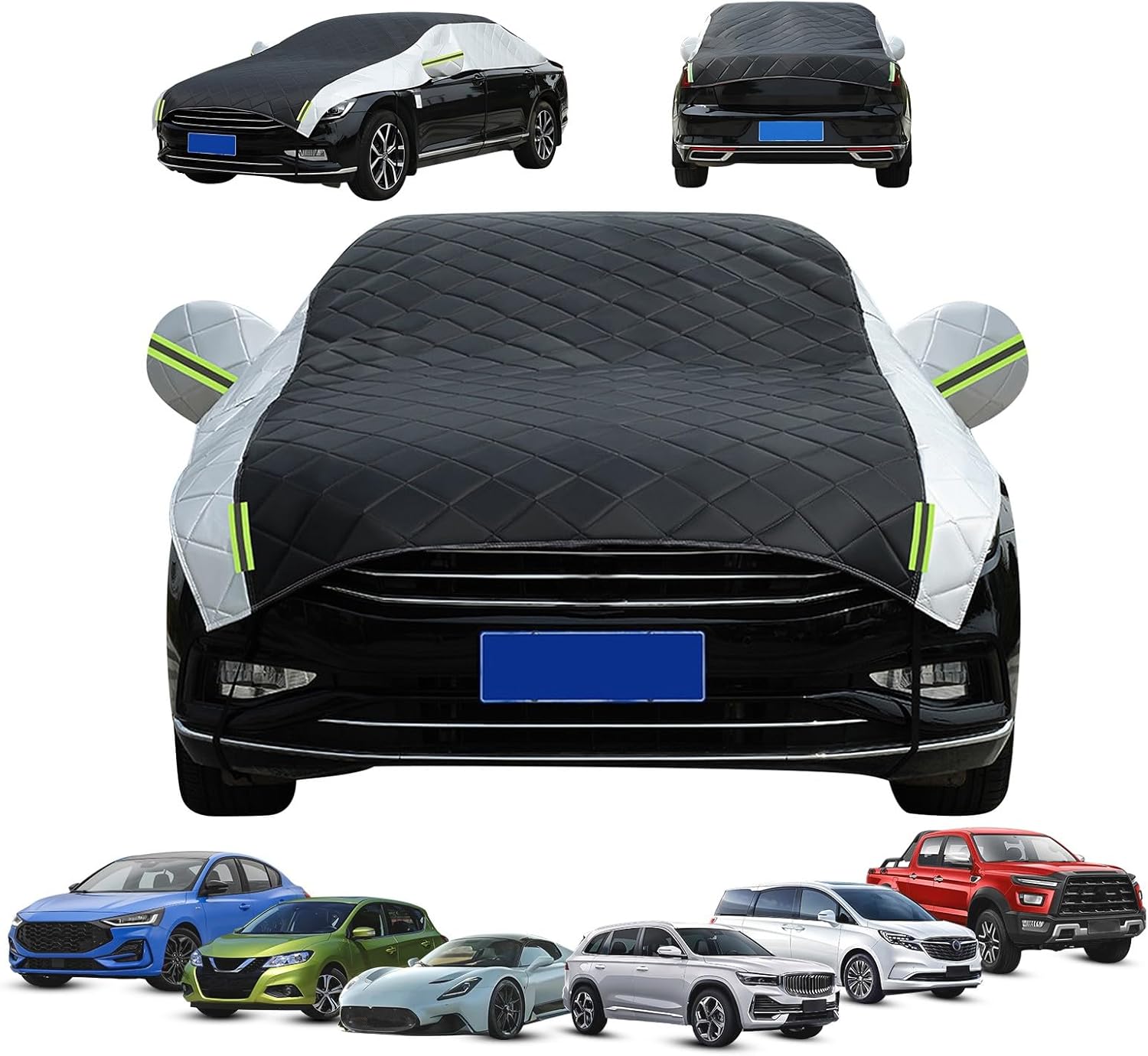 All Weather: The perfect outdoor half car cover for all seasons!Protect your car from tree sap, UV rays, dirt, dust, debris, industrial pollutants, bird droppings and more.It achieves the maximum effect of waterproof, windproof, dustproof, sunscreen, anti-scratch, and outdoor UV protection.
