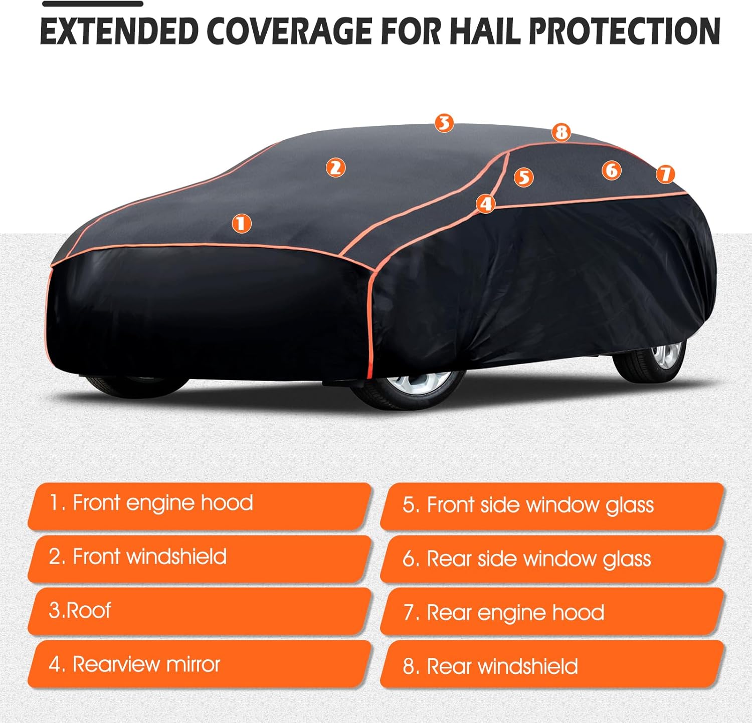 Hail Car Cover Protection: This hail protector car cover is made of 4mm EVA-blended fabric, which can protect your beloved car from hailstones the size of a 5-cent coin. Its widened cushioning area can protect the car roof, rearview mirrors, as well as the side and rear windows. It has excellent shock absorption, wear resistance, tear resistance, and impact resistance, providing comprehensive protection.